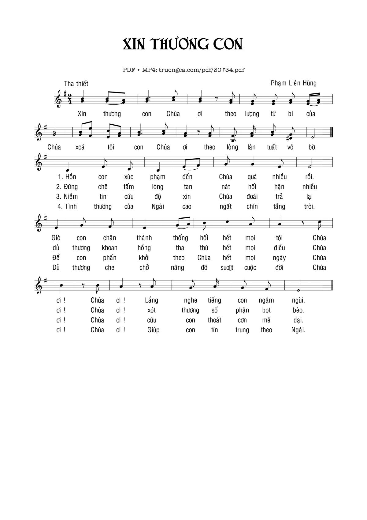Sheet music Xin thương con by Phạm Liên Hùng and PDF file was posted here to support you to practice singing perfectly. Sheets with notes and chords are for reference only, for non-commercial purposes only, not involved with earning money by buying and selling. Copyright is belong to song writer/author and copyright owner. Truongca.com do not own any copyrighted content. You can download the high-quality PDF files which contain staffs by PDF link above.