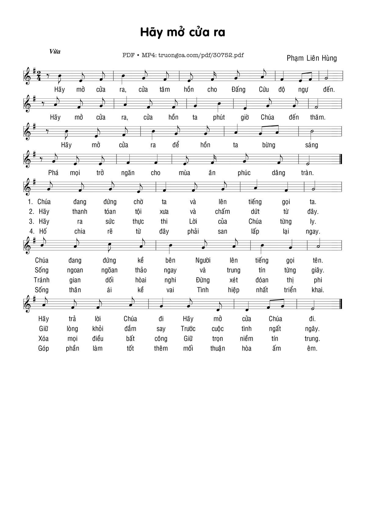 Sheet music Hãy mở cửa ra by Phạm Liên Hùng and PDF file was posted here to support you to practice singing perfectly. Sheets with notes and chords are for reference only, for non-commercial purposes only, not involved with earning money by buying and selling. Copyright is belong to song writer/author and copyright owner. Truongca.com do not own any copyrighted content. You can download the high-quality PDF files which contain staffs by PDF link above.