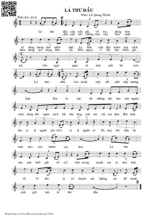 Lê Quang Thịnh Lá thư đầu anh viết gửi về em Dòng tâm tư riêng mang bao niềm nhớ [PDF] [Sheet] [Lyrics] [Mp4/Midi]