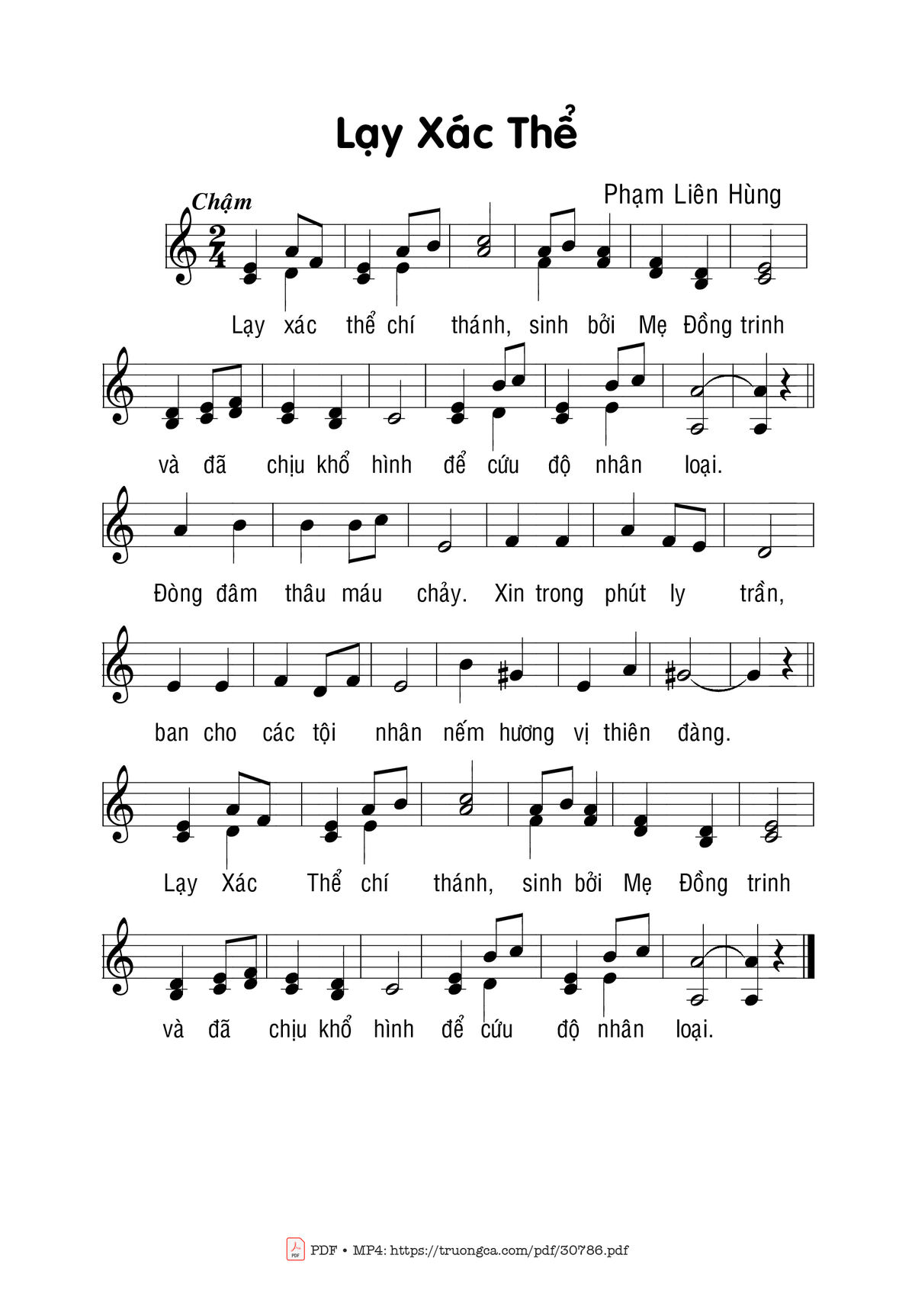Sheet music Lạy xác thể by Phạm Liên Hùng and PDF file was posted here to support you to practice singing perfectly. Sheets with notes and chords are for reference only, for non-commercial purposes only, not involved with earning money by buying and selling. Copyright is belong to song writer/author and copyright owner. Truongca.com do not own any copyrighted content. You can download the high-quality PDF files which contain staffs by PDF link above.