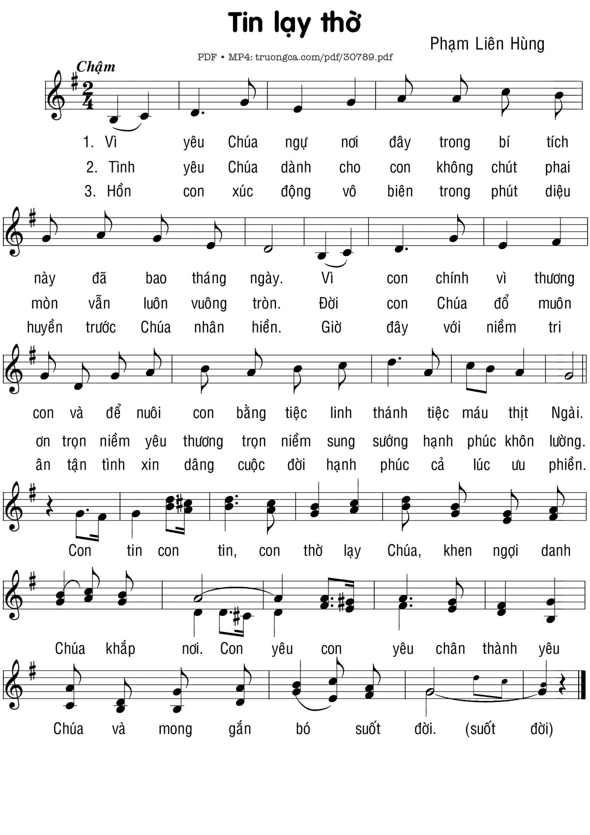 Sheet music Tin lạy thờ by Phạm Liên Hùng and PDF file was posted here to support you to practice singing perfectly. Sheets with notes and chords are for reference only, for non-commercial purposes only, not involved with earning money by buying and selling. Copyright is belong to song writer/author and copyright owner. Truongca.com do not own any copyrighted content. You can download the high-quality PDF files which contain staffs by PDF link above.