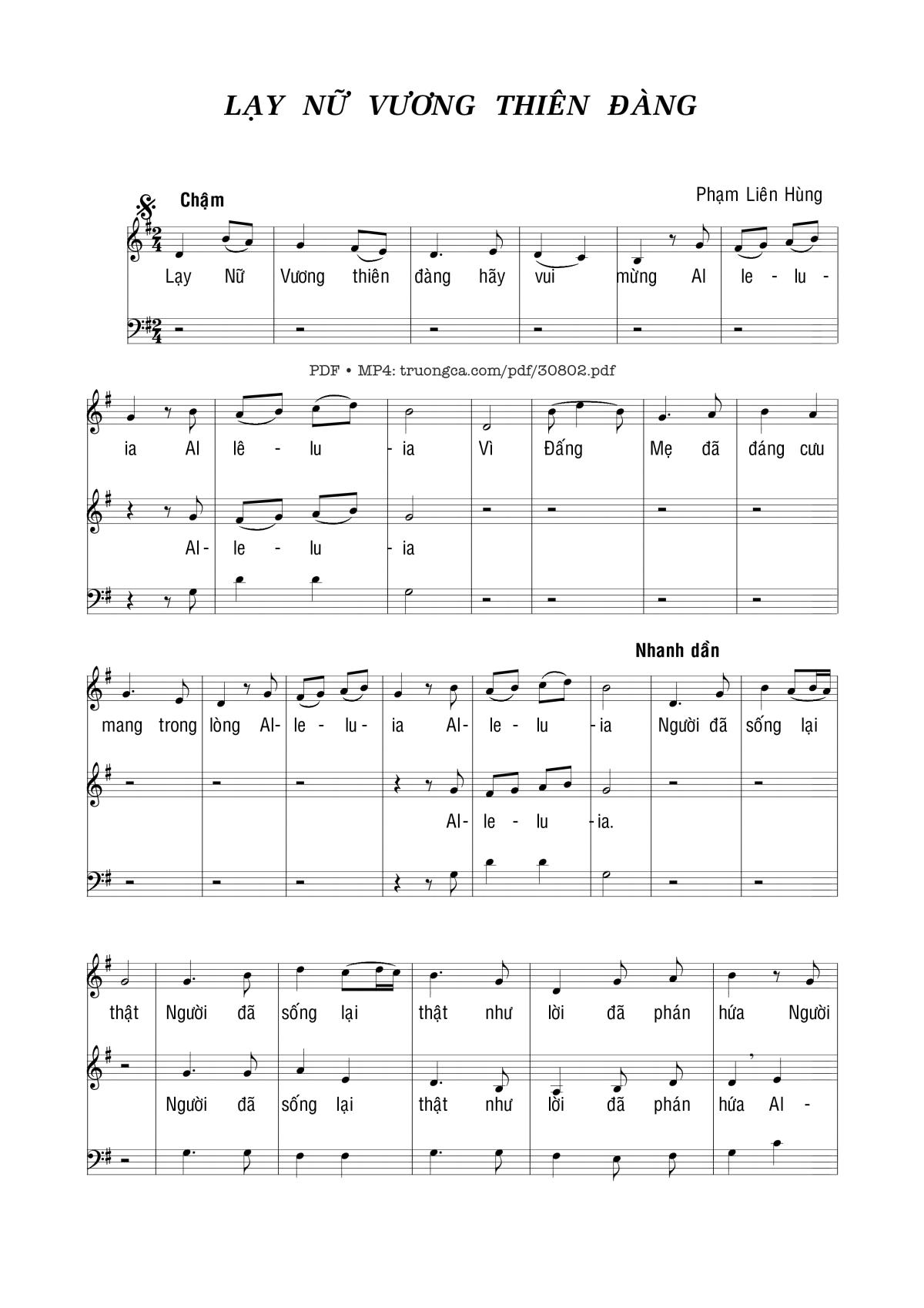 Sheet music Lạy Nữ Vương Thiên Đàng by Phạm Liên Hùng and PDF file was posted here to support you to practice singing perfectly. Sheets with notes and chords are for reference only, for non-commercial purposes only, not involved with earning money by buying and selling. Copyright is belong to song writer/author and copyright owner. Truongca.com do not own any copyrighted content. You can download the high-quality PDF files which contain staffs by PDF link above.
