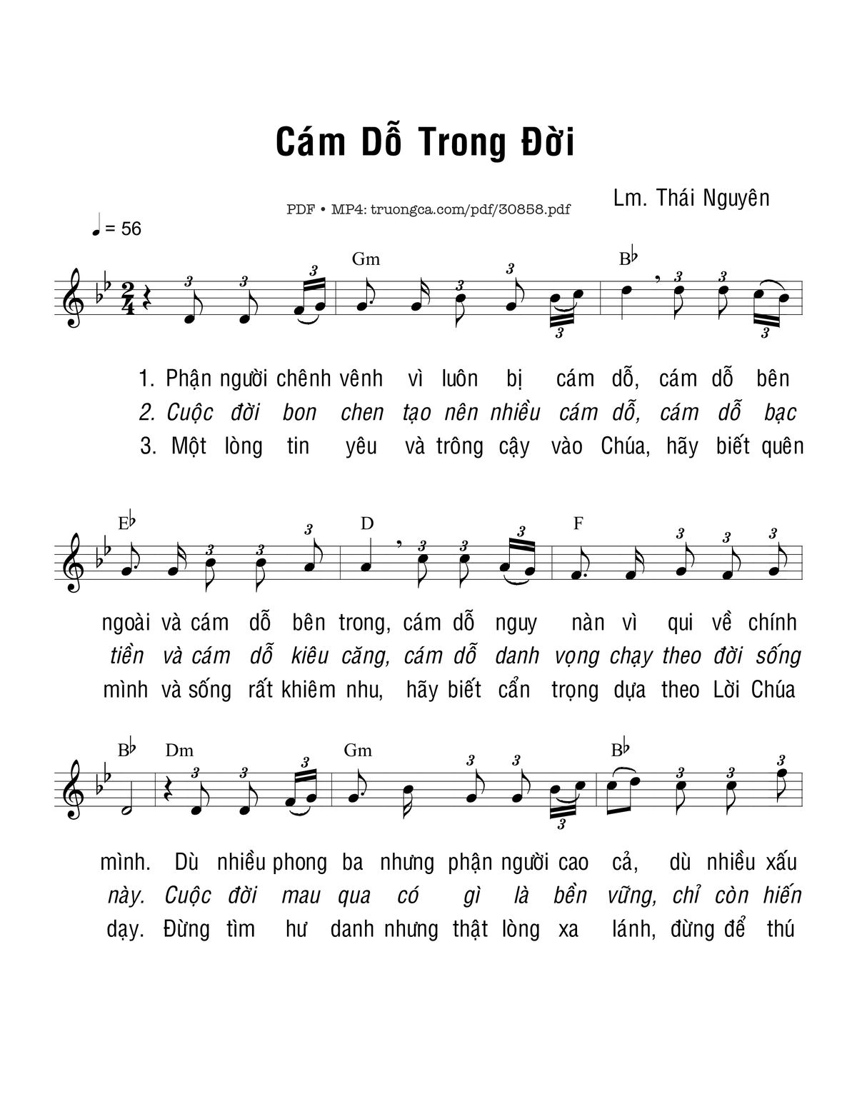Sheet music Cám dỗ trong đời by Thái Nguyên and PDF file was posted here to support you to practice singing perfectly. Sheets with notes and chords are for reference only, for non-commercial purposes only, not involved with earning money by buying and selling. Copyright is belong to song writer/author and copyright owner. Truongca.com do not own any copyrighted content. You can download the high-quality PDF files which contain staffs by PDF link above.