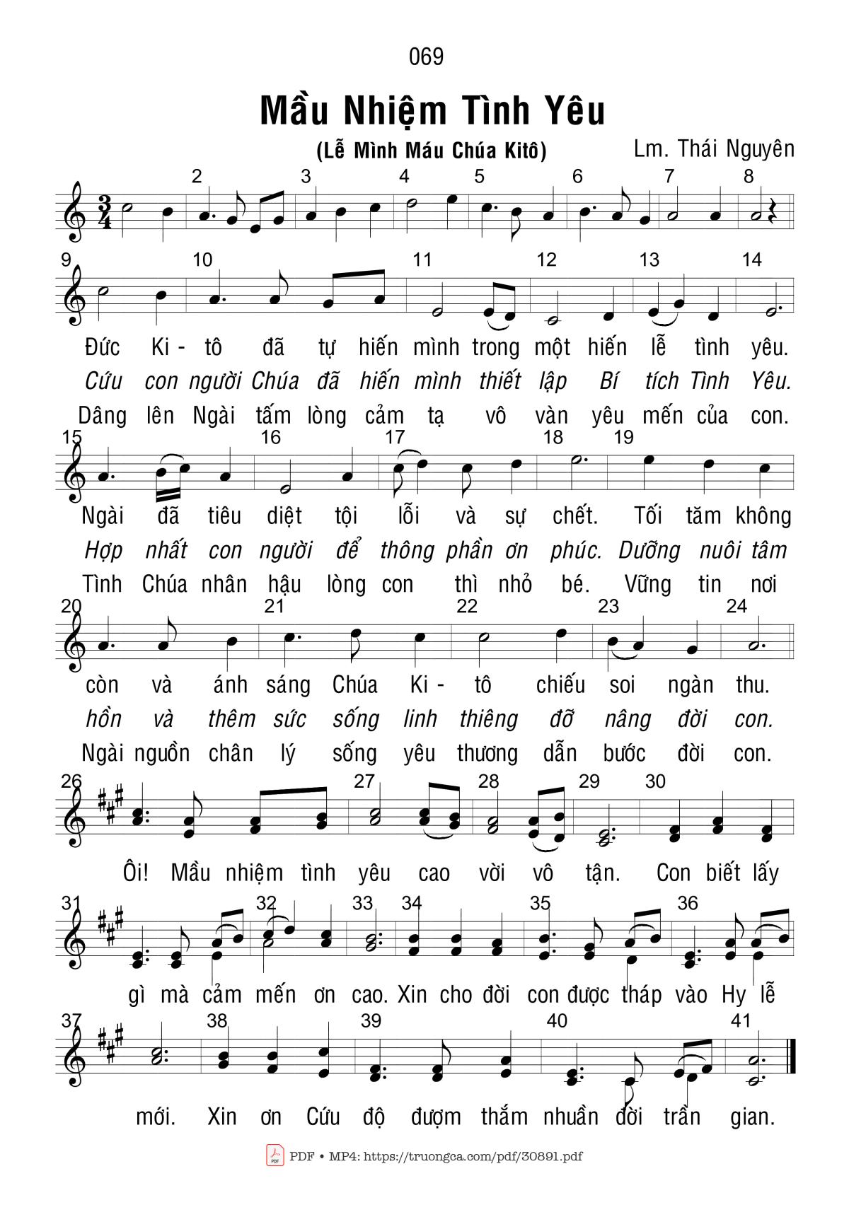 Sheet music Mầu Nhiệm Tình Yêu by Thái Nguyên and PDF file was posted here to support you to practice singing perfectly. Sheets with notes and chords are for reference only, for non-commercial purposes only, not involved with earning money by buying and selling. Copyright is belong to song writer/author and copyright owner. Truongca.com do not own any copyrighted content. You can download the high-quality PDF files which contain staffs by PDF link above.