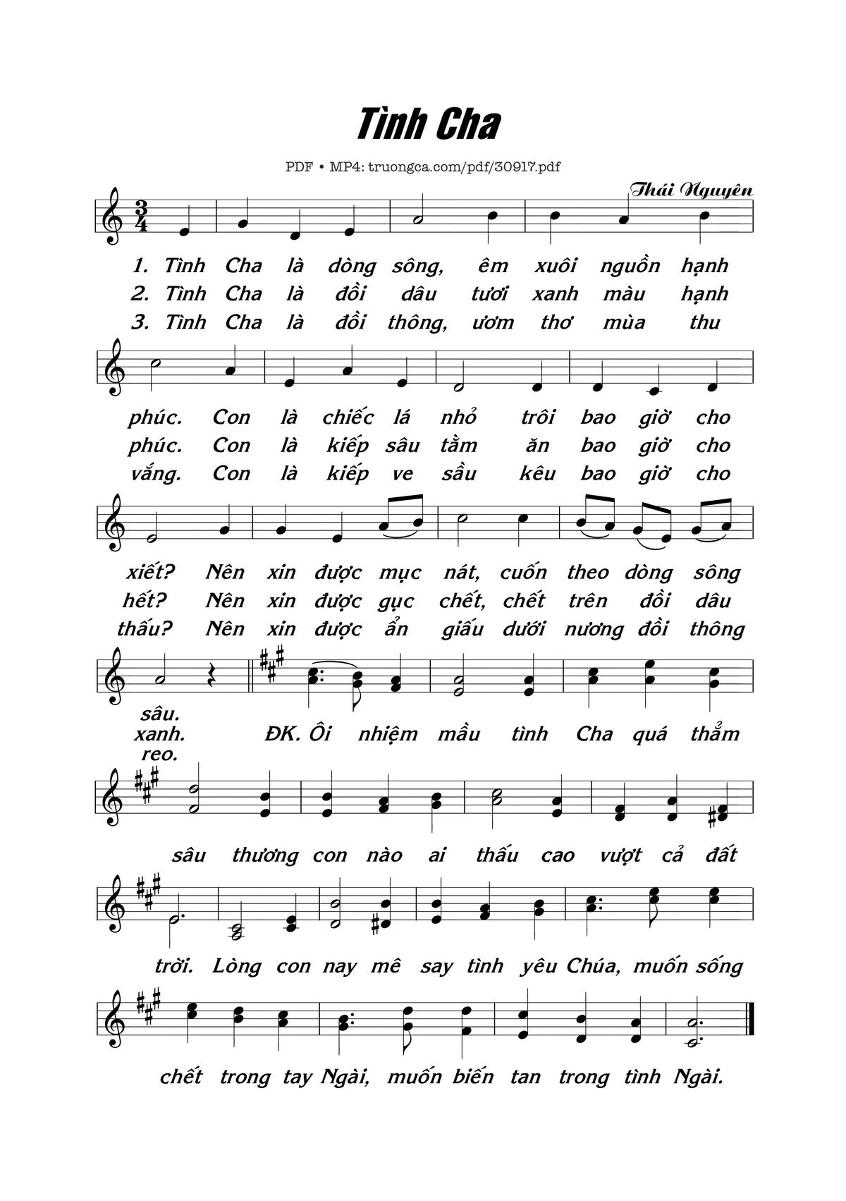 Sheet music Tình Cha by Thái Nguyên and PDF file was posted here to support you to practice singing perfectly. Sheets with notes and chords are for reference only, for non-commercial purposes only, not involved with earning money by buying and selling. Copyright is belong to song writer/author and copyright owner. Truongca.com do not own any copyrighted content. You can download the high-quality PDF files which contain staffs by PDF link above.