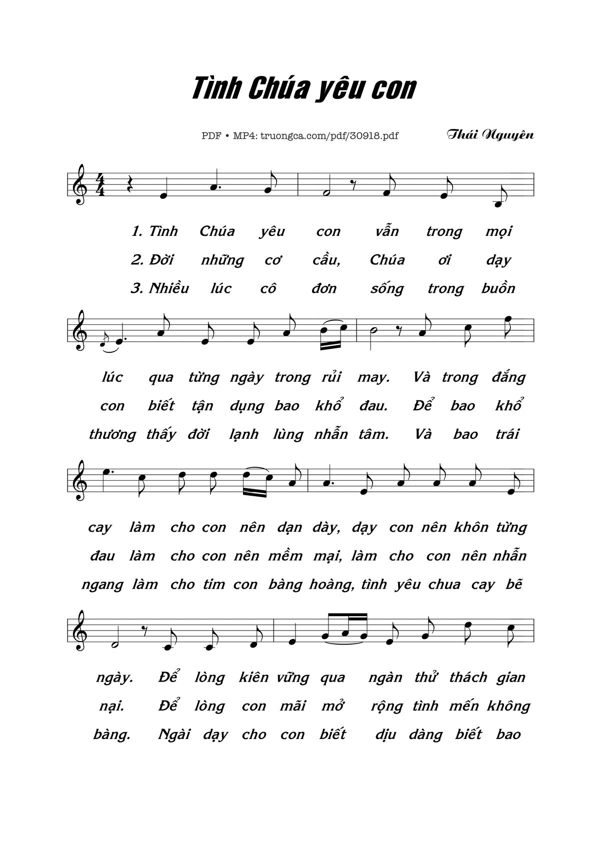 Sheet music Tình Chúa Yêu Con by Thái Nguyên and PDF file was posted here to support you to practice singing perfectly. Sheets with notes and chords are for reference only, for non-commercial purposes only, not involved with earning money by buying and selling. Copyright is belong to song writer/author and copyright owner. Truongca.com do not own any copyrighted content. You can download the high-quality PDF files which contain staffs by PDF link above.