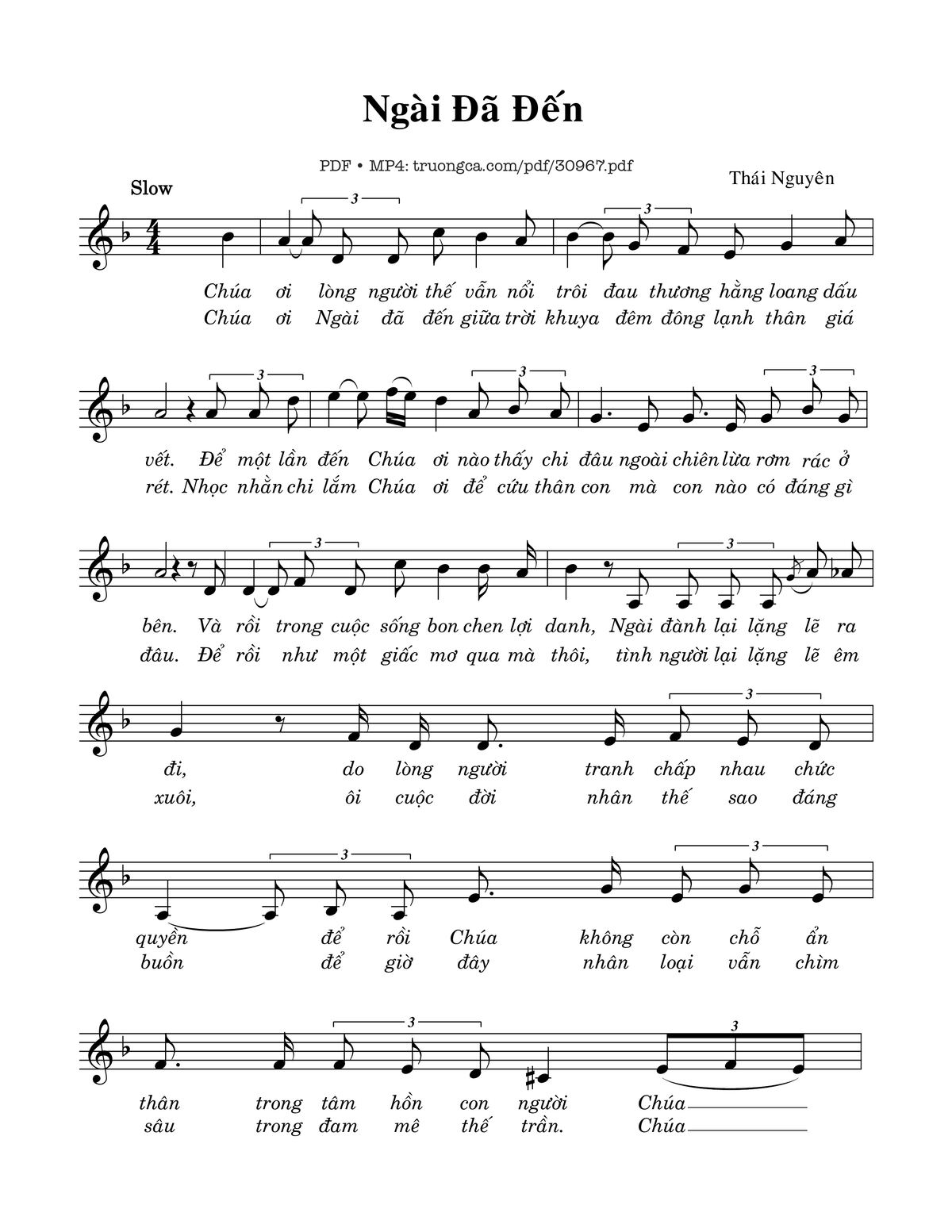 Sheet music Ngài Đã Đến by Thái Nguyên and PDF file was posted here to support you to practice singing perfectly. Sheets with notes and chords are for reference only, for non-commercial purposes only, not involved with earning money by buying and selling. Copyright is belong to song writer/author and copyright owner. Truongca.com do not own any copyrighted content. You can download the high-quality PDF files which contain staffs by PDF link above.