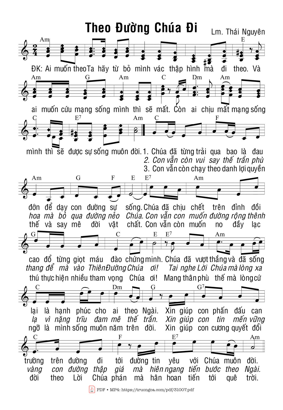 Sheet music Theo Đường Chúa Đi by Thái Nguyên and PDF file was posted here to support you to practice singing perfectly. Sheets with notes and chords are for reference only, for non-commercial purposes only, not involved with earning money by buying and selling. Copyright is belong to song writer/author and copyright owner. Truongca.com do not own any copyrighted content. You can download the high-quality PDF files which contain staffs by PDF link above.