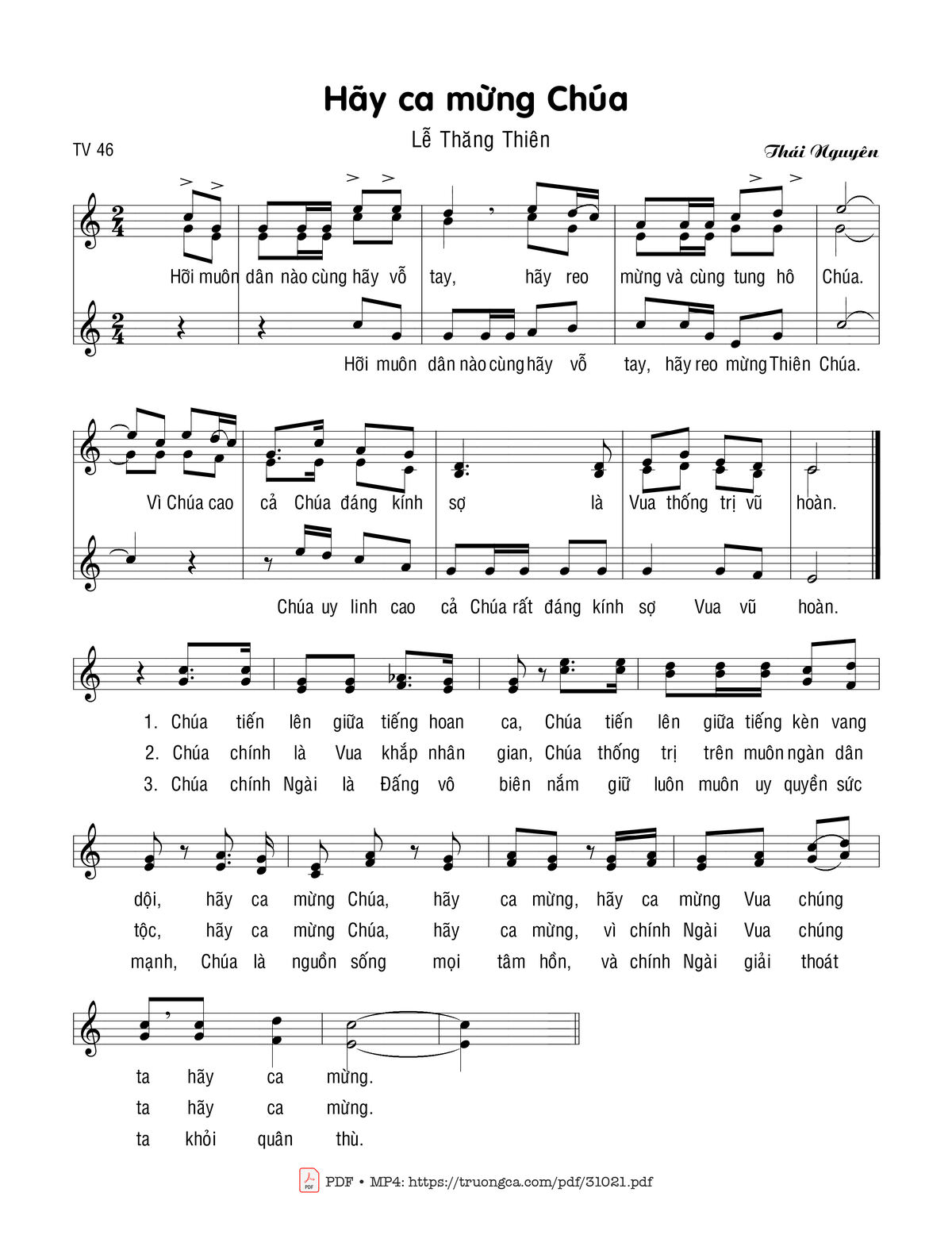 Sheet music Hãy ca mừng Chúa by Thái Nguyên and PDF file was posted here to support you to practice singing perfectly. Sheets with notes and chords are for reference only, for non-commercial purposes only, not involved with earning money by buying and selling. Copyright is belong to song writer/author and copyright owner. Truongca.com do not own any copyrighted content. You can download the high-quality PDF files which contain staffs by PDF link above.