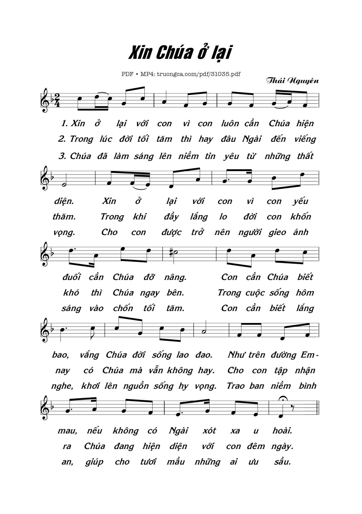 Sheet music Xin Chúa ở lại by Thái Nguyên and PDF file was posted here to support you to practice singing perfectly. Sheets with notes and chords are for reference only, for non-commercial purposes only, not involved with earning money by buying and selling. Copyright is belong to song writer/author and copyright owner. Truongca.com do not own any copyrighted content. You can download the high-quality PDF files which contain staffs by PDF link above.