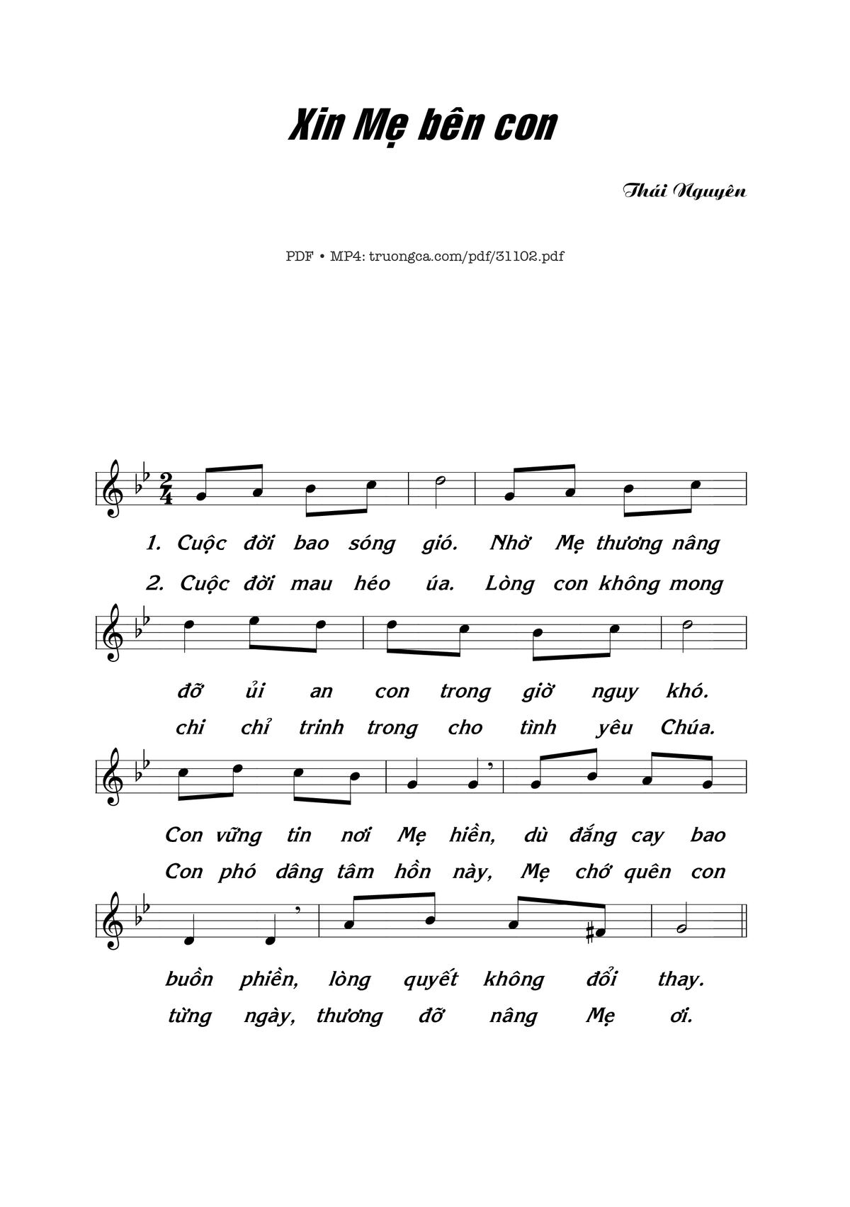 Transposition is the process of moving a song's melody and chords up or down in pitch by a constant interval. The direction of the transposition tool is indicated by a plus (+) sign for up and a minus (-) sign for down. Hover mouse over chords signs to see the chords chart of Xin Mẹ bên con song.