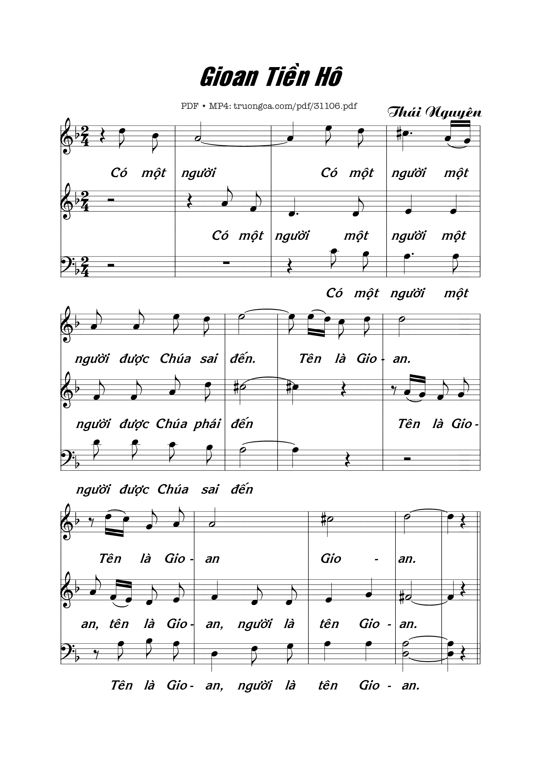 Sheet music Gioan Tiền Hô by Thái Nguyên and PDF file was posted here to support you to practice singing perfectly. Sheets with notes and chords are for reference only, for non-commercial purposes only, not involved with earning money by buying and selling. Copyright is belong to song writer/author and copyright owner. Truongca.com do not own any copyrighted content. You can download the high-quality PDF files which contain staffs by PDF link above.