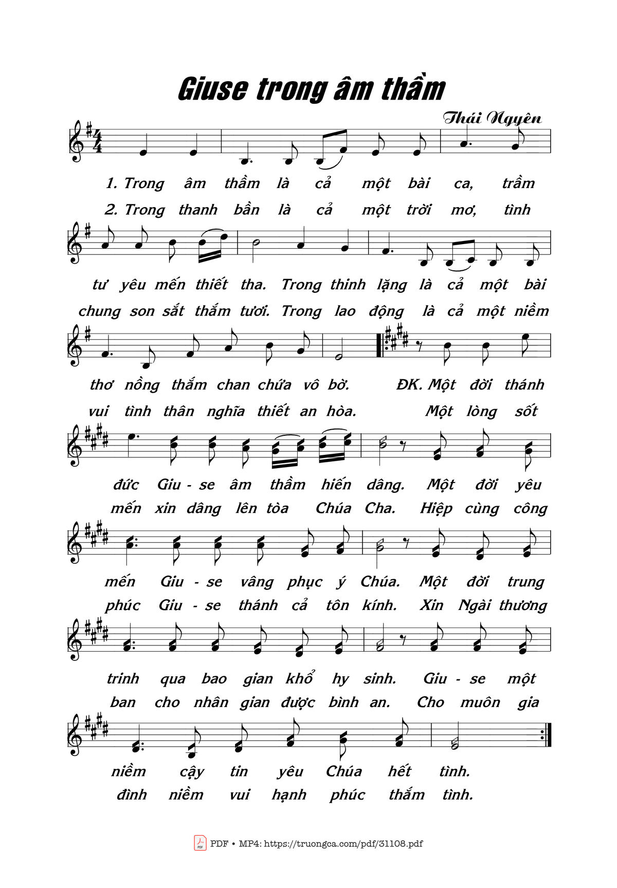 Sheet music Giuse trong âm thầm by Thái Nguyên and PDF file was posted here to support you to practice singing perfectly. Sheets with notes and chords are for reference only, for non-commercial purposes only, not involved with earning money by buying and selling. Copyright is belong to song writer/author and copyright owner. Truongca.com do not own any copyrighted content. You can download the high-quality PDF files which contain staffs by PDF link above.