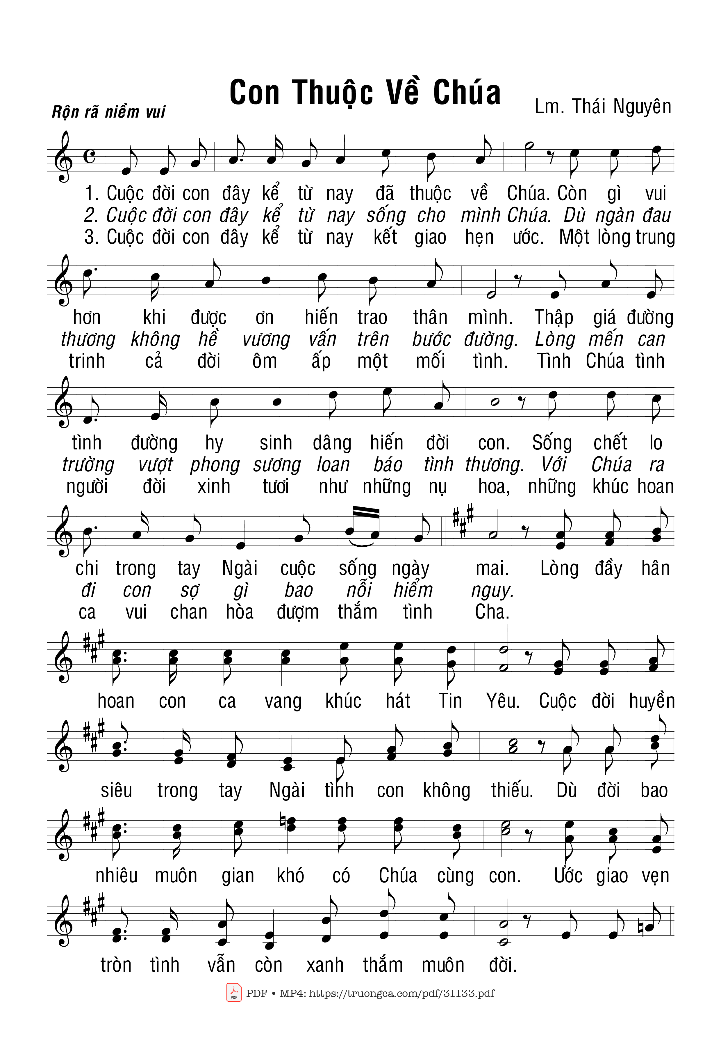 Sheet music Con thuộc về Chúa by Thái Nguyên and PDF file was posted here to support you to practice singing perfectly. Sheets with notes and chords are for reference only, for non-commercial purposes only, not involved with earning money by buying and selling. Copyright is belong to song writer/author and copyright owner. Truongca.com do not own any copyrighted content. You can download the high-quality PDF files which contain staffs by PDF link above.