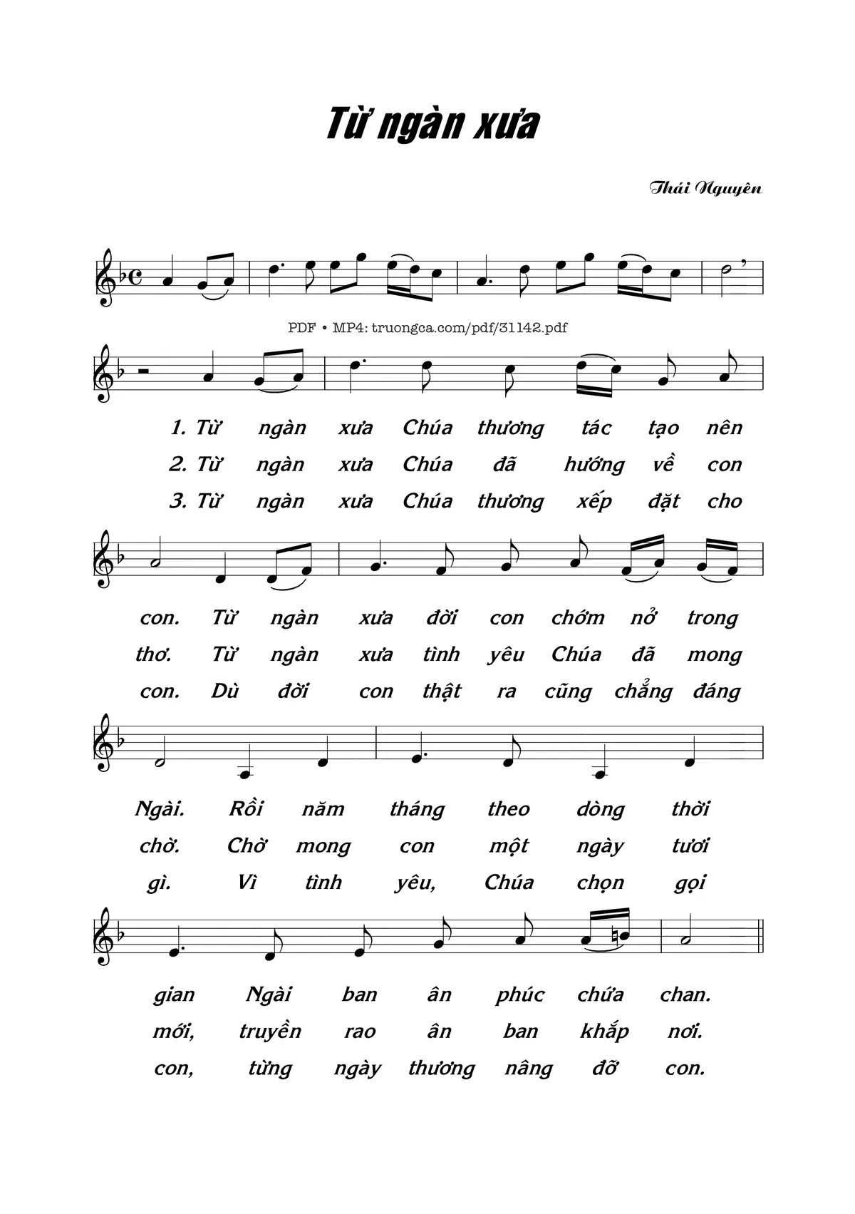 Sheet music Từ Ngàn Xưa by Thái Nguyên and PDF file was posted here to support you to practice singing perfectly. Sheets with notes and chords are for reference only, for non-commercial purposes only, not involved with earning money by buying and selling. Copyright is belong to song writer/author and copyright owner. Truongca.com do not own any copyrighted content. You can download the high-quality PDF files which contain staffs by PDF link above.