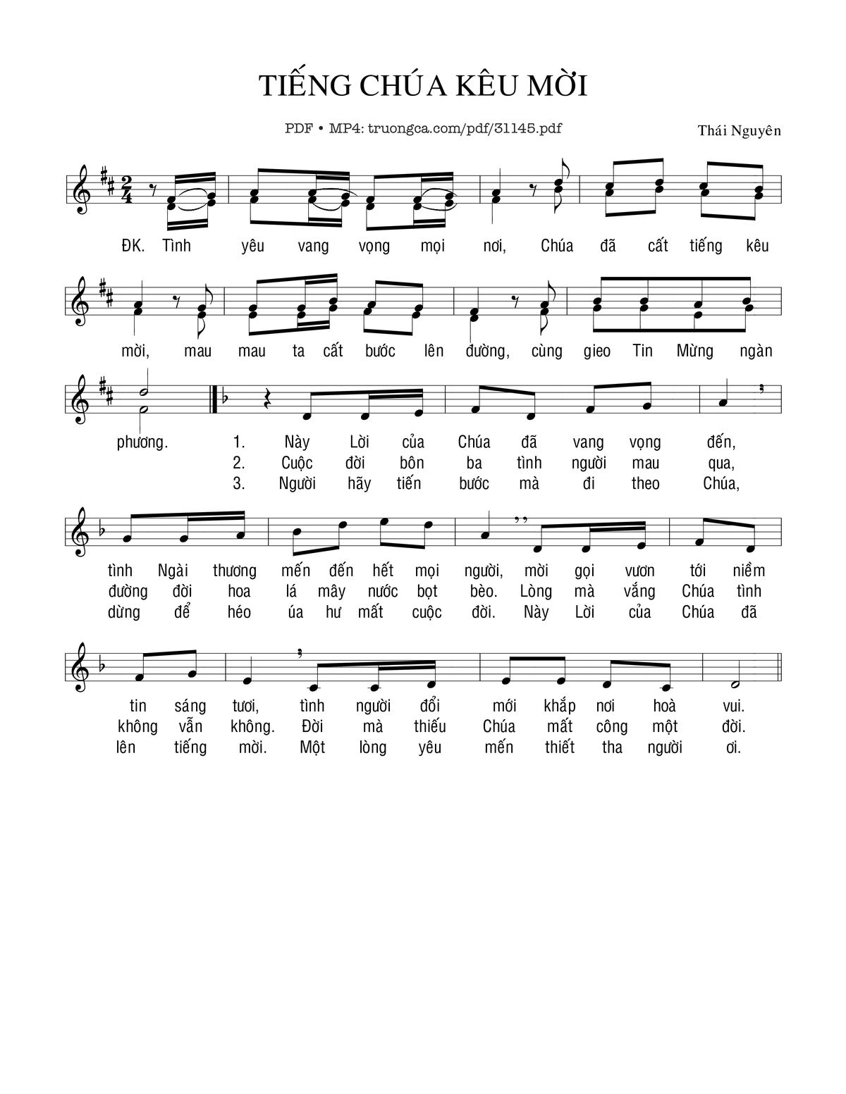 Sheet music Tiếng Chúa kêu mời by Thái Nguyên and PDF file was posted here to support you to practice singing perfectly. Sheets with notes and chords are for reference only, for non-commercial purposes only, not involved with earning money by buying and selling. Copyright is belong to song writer/author and copyright owner. Truongca.com do not own any copyrighted content. You can download the high-quality PDF files which contain staffs by PDF link above.