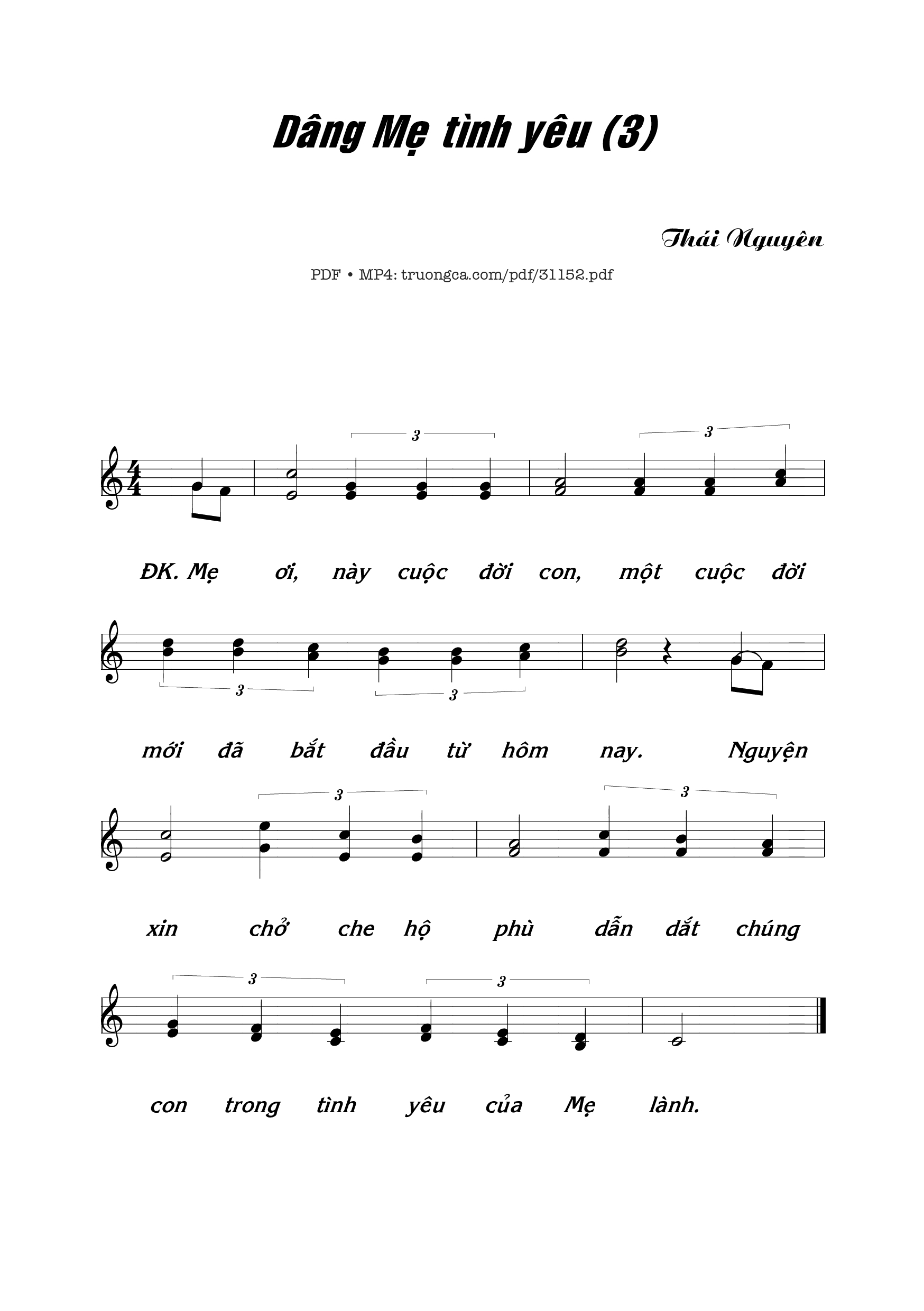 Sheet music Dâng Mẹ Tình Yêu 3 by Thái Nguyên and PDF file was posted here to support you to practice singing perfectly. Sheets with notes and chords are for reference only, for non-commercial purposes only, not involved with earning money by buying and selling. Copyright is belong to song writer/author and copyright owner. Truongca.com do not own any copyrighted content. You can download the high-quality PDF files which contain staffs by PDF link above.