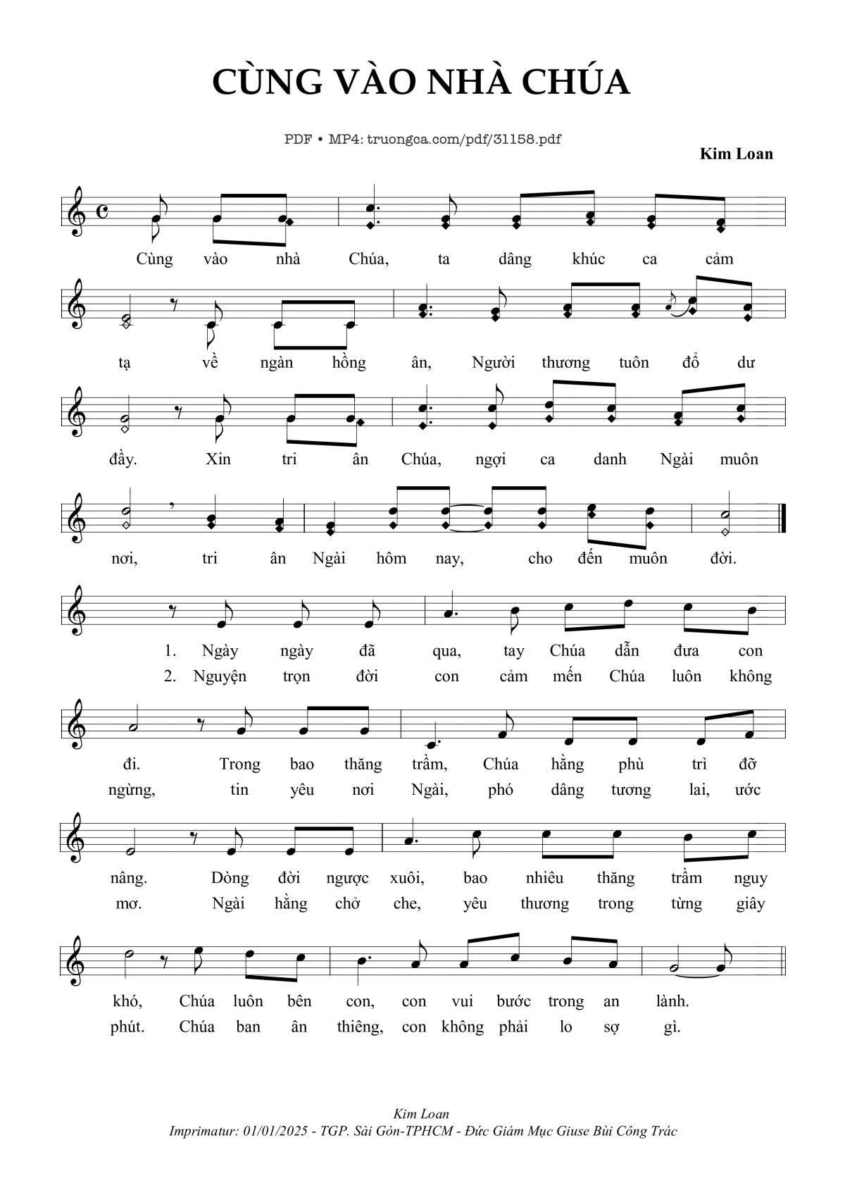 Điệp khúc. Cùng vào nhà Chúa, ta dâng khúc ca cảm tạ về ngày hồng ân, Người thương tuôn đổ dư đầy. Xin tri ân Chúa, ngợi ca danh Ngài muôn nơi, tri ân Ngài hôm nay cho đến muôn đời.