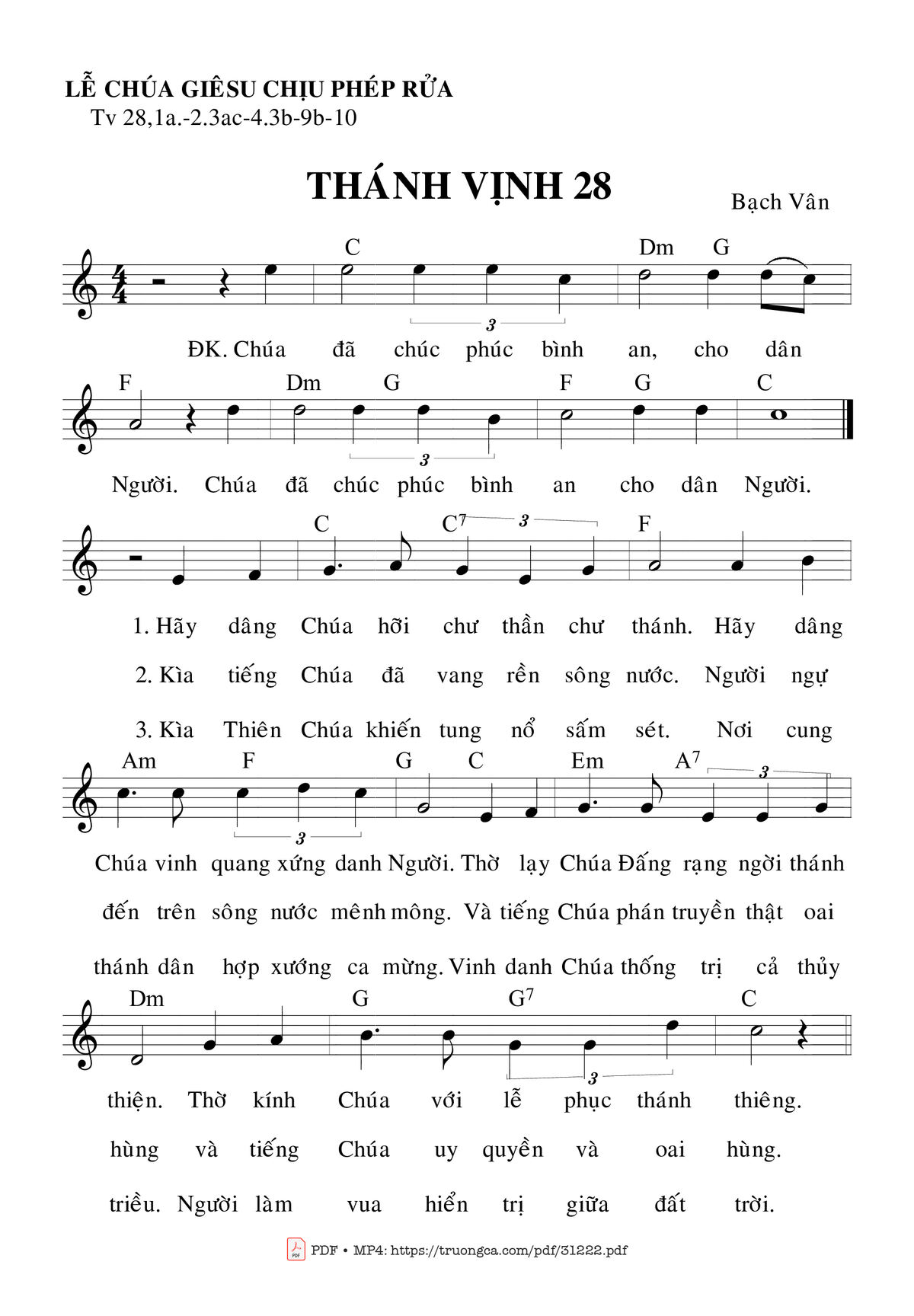 Sheet music Thánh Vịnh 28, Lễ Chúa Giêsu Chịu Phép Rửa by Bạch Vân and PDF file was posted here to support you to practice singing perfectly. Sheets with notes and chords are for reference only, for non-commercial purposes only, not involved with earning money by buying and selling. Copyright is belong to song writer/author and copyright owner. Truongca.com do not own any copyrighted content. You can download the high-quality PDF files which contain staffs by PDF link above.