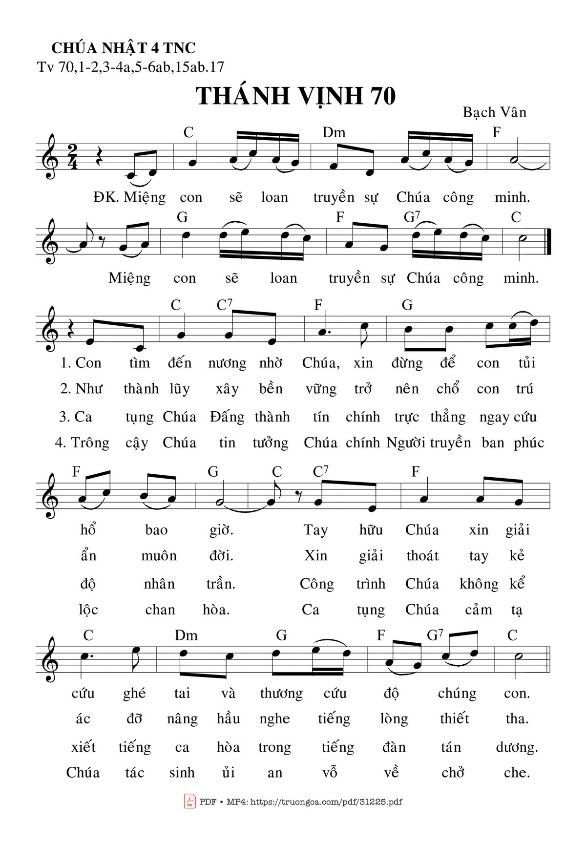 Sheet music Thánh Vịnh 70, Chúa Nhật 4C Thường Niên by Bạch Vân and PDF file was posted here to support you to practice singing perfectly. Sheets with notes and chords are for reference only, for non-commercial purposes only, not involved with earning money by buying and selling. Copyright is belong to song writer/author and copyright owner. Truongca.com do not own any copyrighted content. You can download the high-quality PDF files which contain staffs by PDF link above.