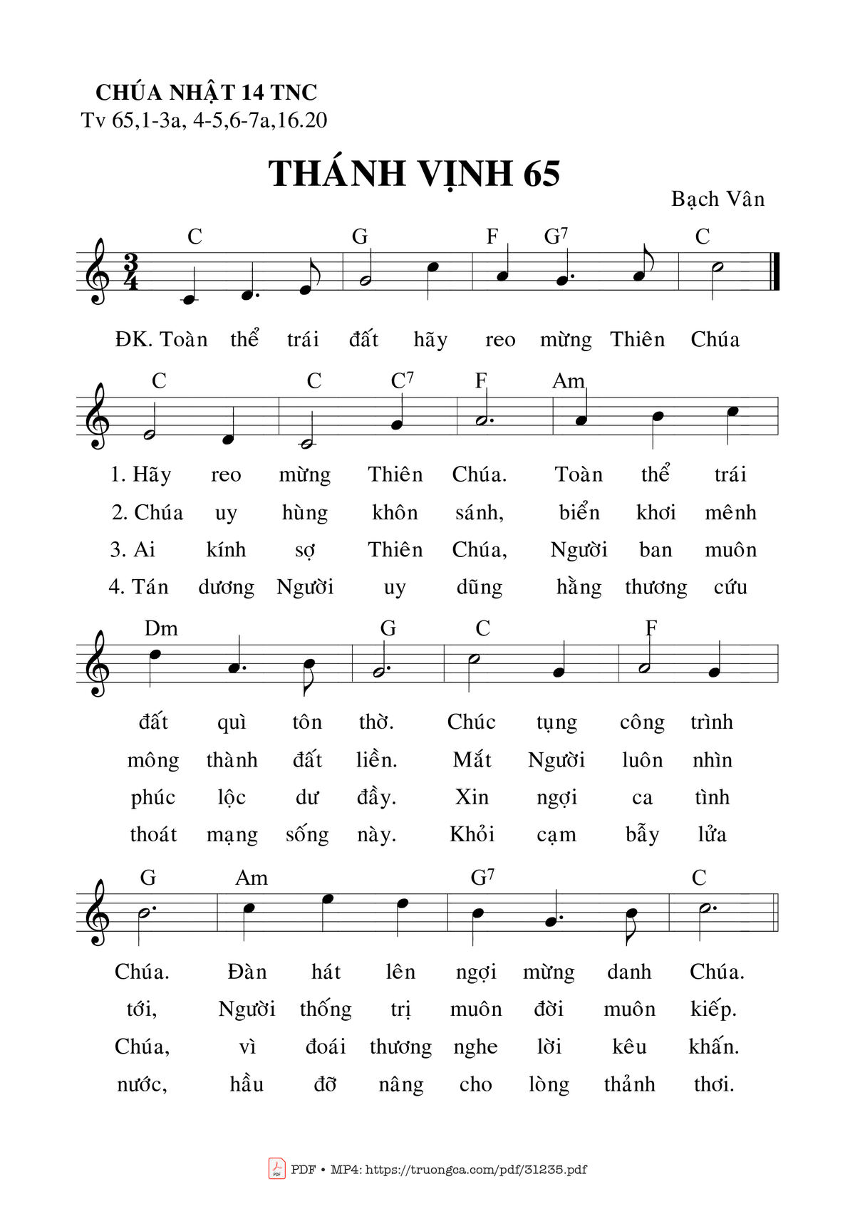 Sheet music Thánh Vịnh 65, Chúa Nhật 14C Thường Niên by Bạch Vân and PDF file was posted here to support you to practice singing perfectly. Sheets with notes and chords are for reference only, for non-commercial purposes only, not involved with earning money by buying and selling. Copyright is belong to song writer/author and copyright owner. Truongca.com do not own any copyrighted content. You can download the high-quality PDF files which contain staffs by PDF link above.