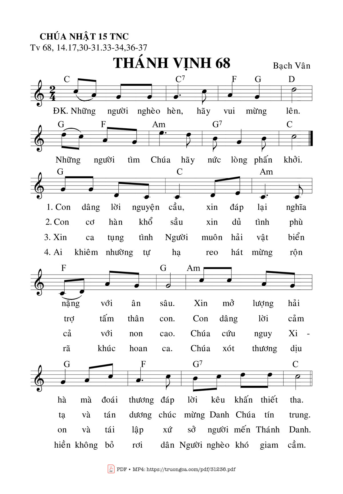 Sheet music Thánh Vịnh 68, Chúa Nhật 15C Thường Niên by Bạch Vân and PDF file was posted here to support you to practice singing perfectly. Sheets with notes and chords are for reference only, for non-commercial purposes only, not involved with earning money by buying and selling. Copyright is belong to song writer/author and copyright owner. Truongca.com do not own any copyrighted content. You can download the high-quality PDF files which contain staffs by PDF link above.