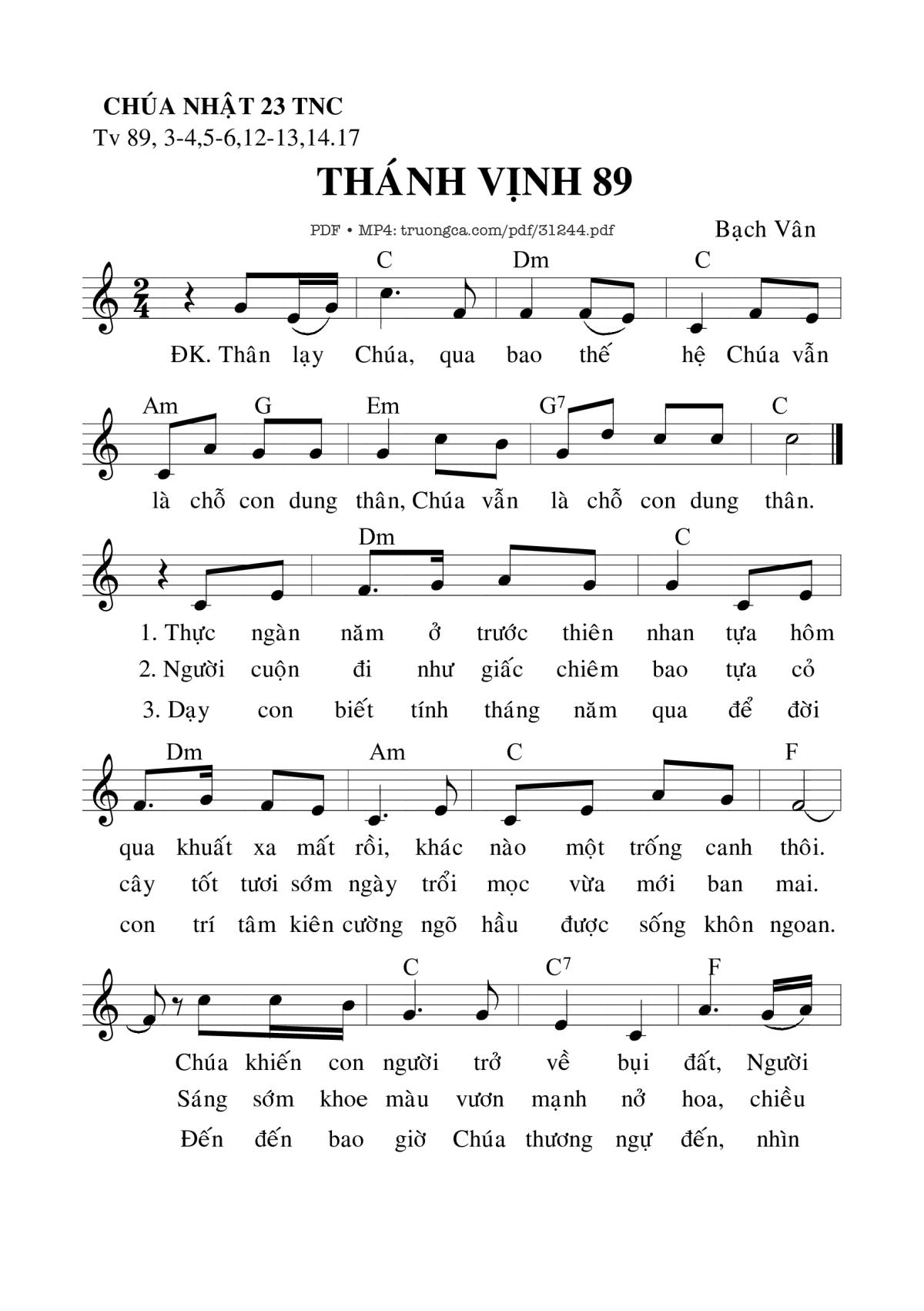 Sheet music Thánh Vịnh 89, Chúa Nhật 23C Thường Niên by Bạch Vân and PDF file was posted here to support you to practice singing perfectly. Sheets with notes and chords are for reference only, for non-commercial purposes only, not involved with earning money by buying and selling. Copyright is belong to song writer/author and copyright owner. Truongca.com do not own any copyrighted content. You can download the high-quality PDF files which contain staffs by PDF link above.
