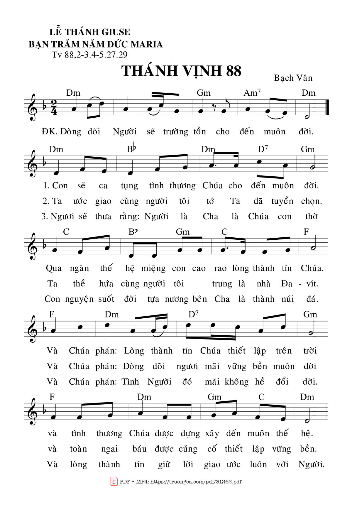 Sheet music Thánh Vịnh 88, Lễ Thánh Giuse by Bạch Vân and PDF file was posted here to support you to practice singing perfectly. Sheets with notes and chords are for reference only, for non-commercial purposes only, not involved with earning money by buying and selling. Copyright is belong to song writer/author and copyright owner. Truongca.com do not own any copyrighted content. You can download the high-quality PDF files which contain staffs by PDF link above.