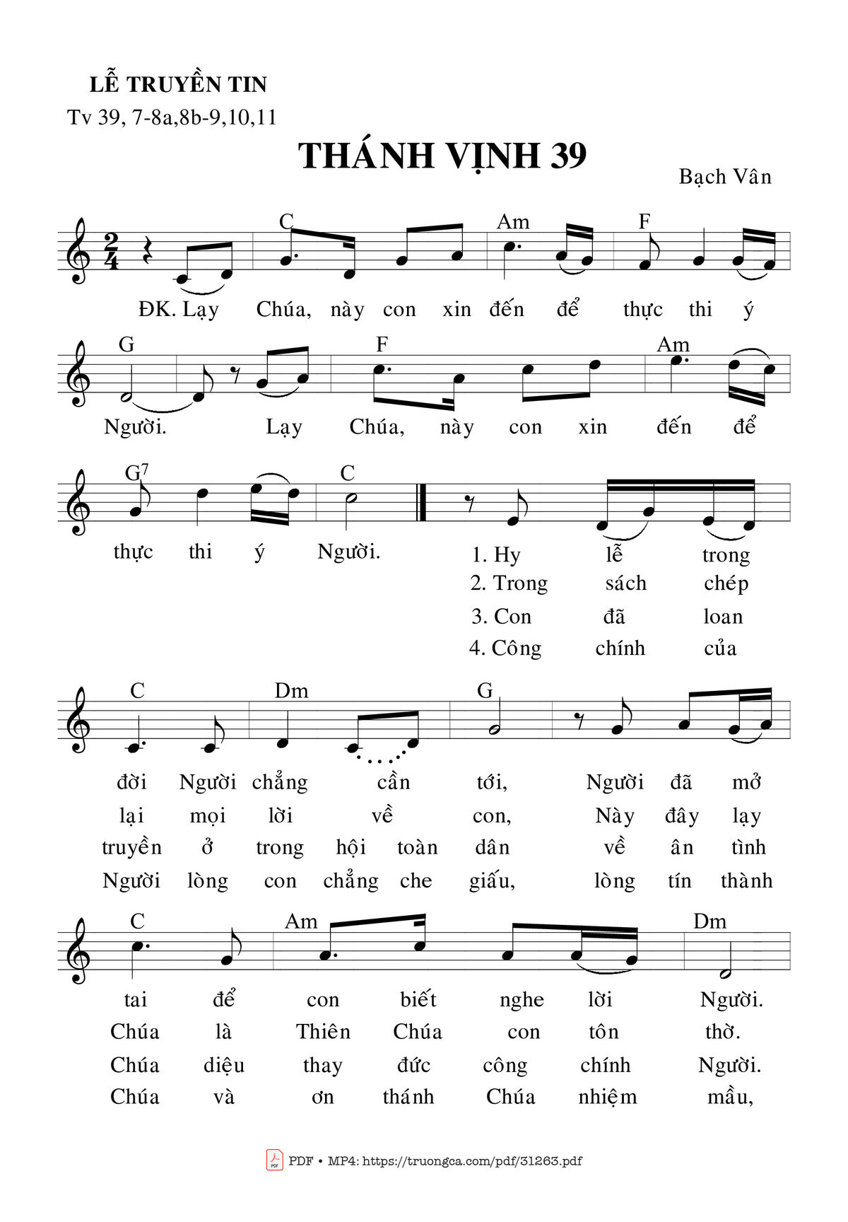 Sheet music Thánh Vịnh 39, Lễ Truyền Tin by Bạch Vân and PDF file was posted here to support you to practice singing perfectly. Sheets with notes and chords are for reference only, for non-commercial purposes only, not involved with earning money by buying and selling. Copyright is belong to song writer/author and copyright owner. Truongca.com do not own any copyrighted content. You can download the high-quality PDF files which contain staffs by PDF link above.