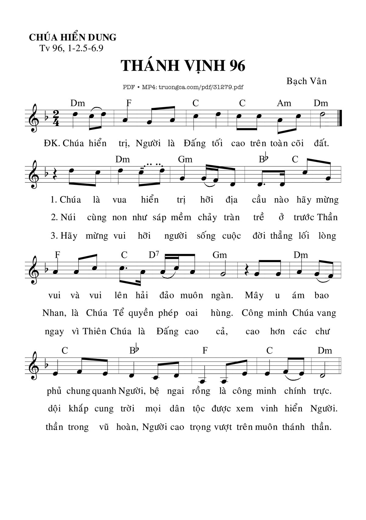 Sheet music Thánh Vịnh 96, Lễ Chúa Hiển Dung by Bạch Vân and PDF file was posted here to support you to practice singing perfectly. Sheets with notes and chords are for reference only, for non-commercial purposes only, not involved with earning money by buying and selling. Copyright is belong to song writer/author and copyright owner. Truongca.com do not own any copyrighted content. You can download the high-quality PDF files which contain staffs by PDF link above.