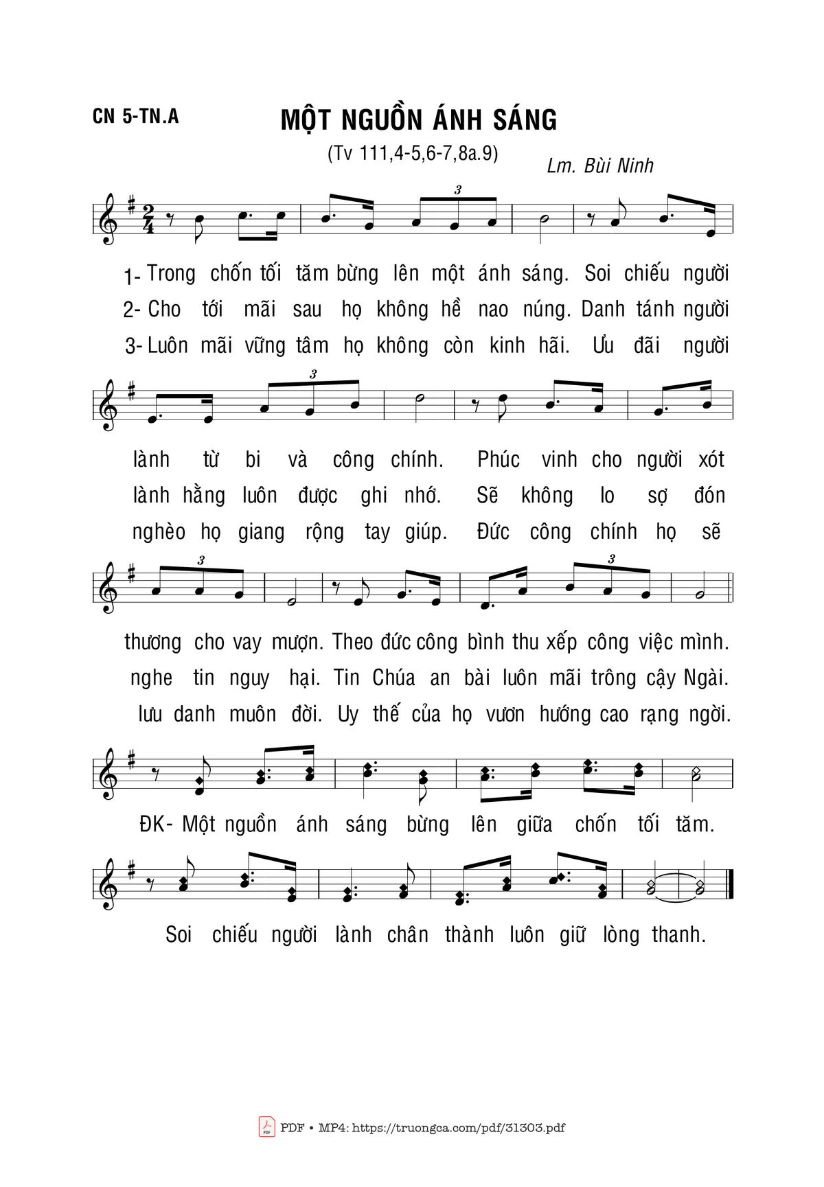 Sheet music Một Nguồn Ánh Sáng by Bùi Ninh and PDF file was posted here to support you to practice singing perfectly. Sheets with notes and chords are for reference only, for non-commercial purposes only, not involved with earning money by buying and selling. Copyright is belong to song writer/author and copyright owner. Truongca.com do not own any copyrighted content. You can download the high-quality PDF files which contain staffs by PDF link above.
