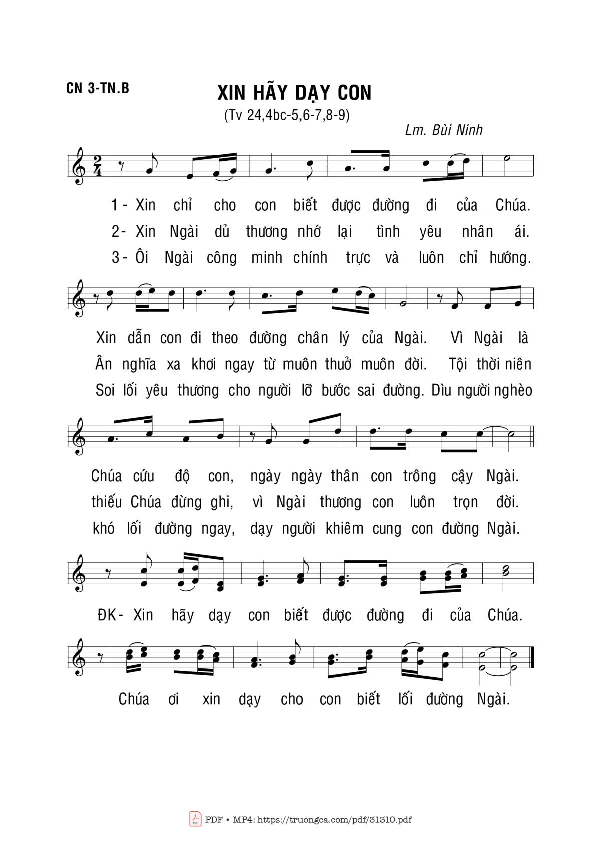 Sheet music Xin Hãy Dạy Con by Bùi Ninh and PDF file was posted here to support you to practice singing perfectly. Sheets with notes and chords are for reference only, for non-commercial purposes only, not involved with earning money by buying and selling. Copyright is belong to song writer/author and copyright owner. Truongca.com do not own any copyrighted content. You can download the high-quality PDF files which contain staffs by PDF link above.