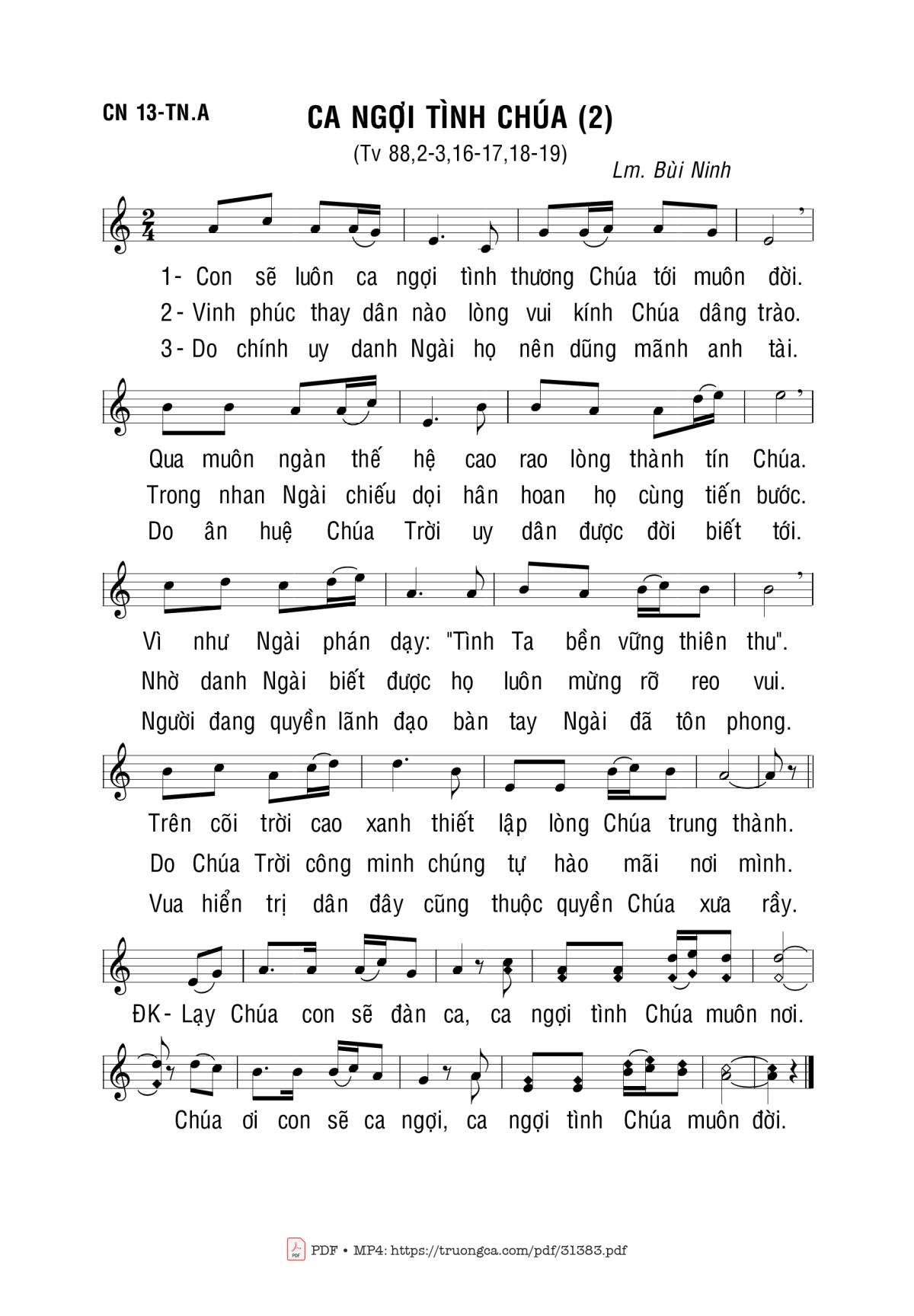 Sheet music Ca Ngợi Tình Chúa (2) by Bùi Ninh and PDF file was posted here to support you to practice singing perfectly. Sheets with notes and chords are for reference only, for non-commercial purposes only, not involved with earning money by buying and selling. Copyright is belong to song writer/author and copyright owner. Truongca.com do not own any copyrighted content. You can download the high-quality PDF files which contain staffs by PDF link above.
