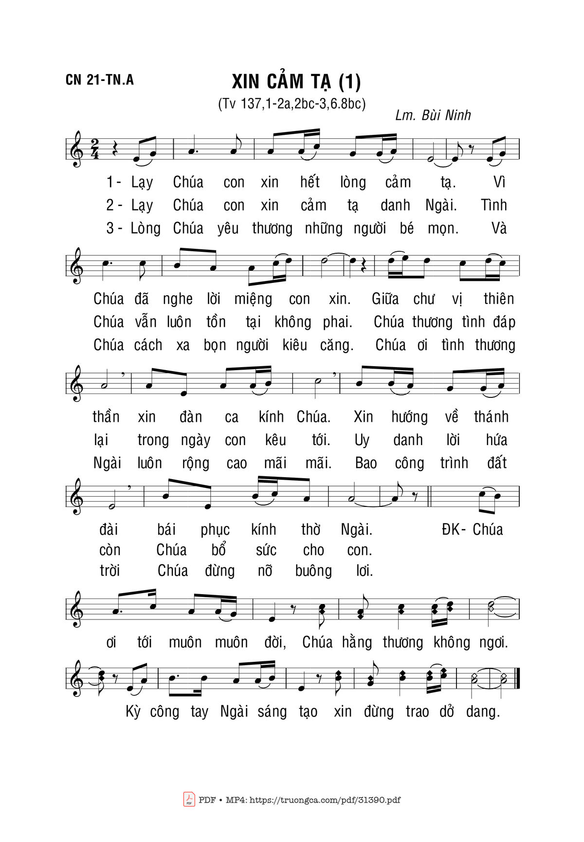Sheet music Xin Cảm Tạ (1) by Bùi Ninh and PDF file was posted here to support you to practice singing perfectly. Sheets with notes and chords are for reference only, for non-commercial purposes only, not involved with earning money by buying and selling. Copyright is belong to song writer/author and copyright owner. Truongca.com do not own any copyrighted content. You can download the high-quality PDF files which contain staffs by PDF link above.