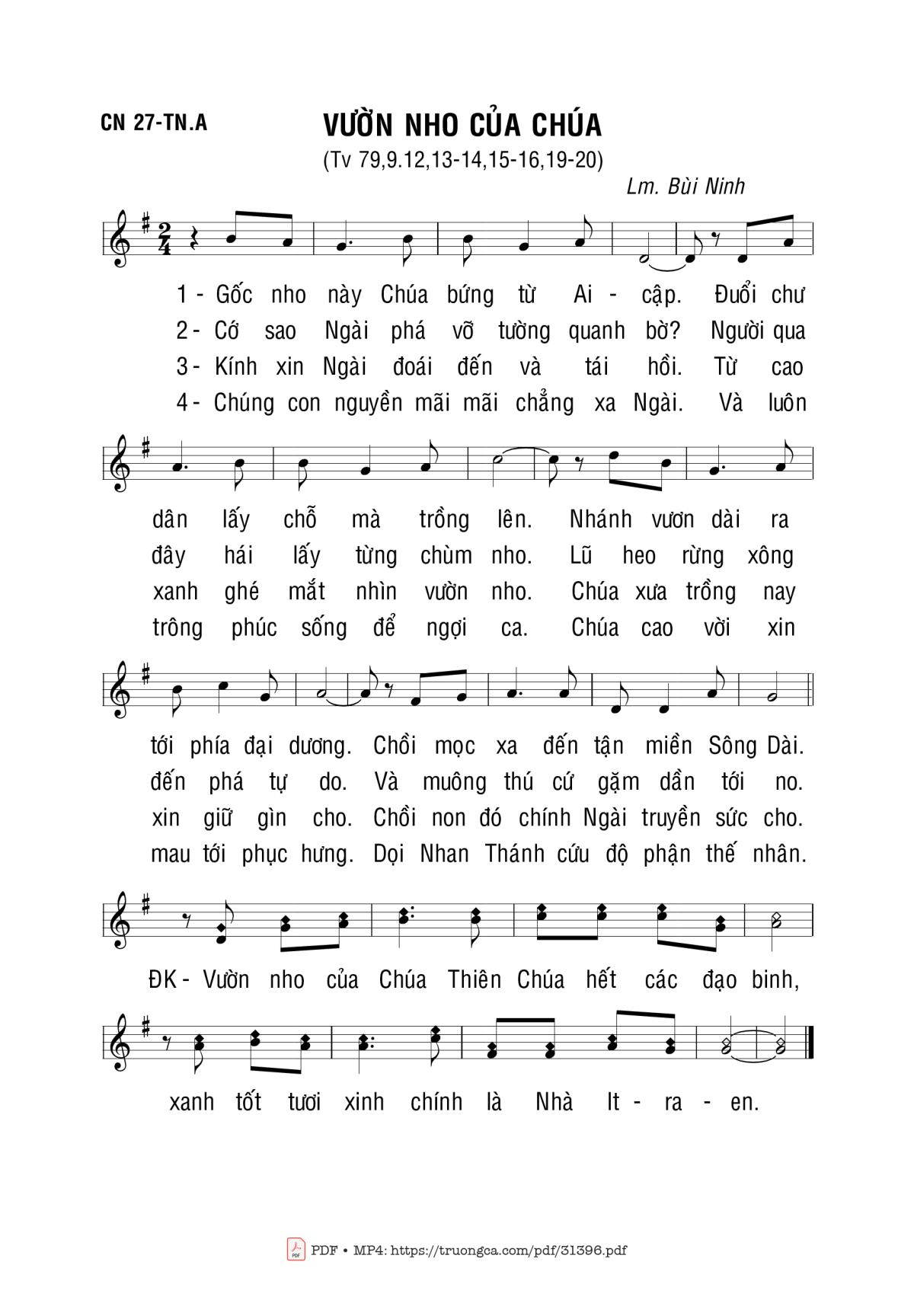 Sheet music Vườn Nho Của Chúa by Bùi Ninh and PDF file was posted here to support you to practice singing perfectly. Sheets with notes and chords are for reference only, for non-commercial purposes only, not involved with earning money by buying and selling. Copyright is belong to song writer/author and copyright owner. Truongca.com do not own any copyrighted content. You can download the high-quality PDF files which contain staffs by PDF link above.