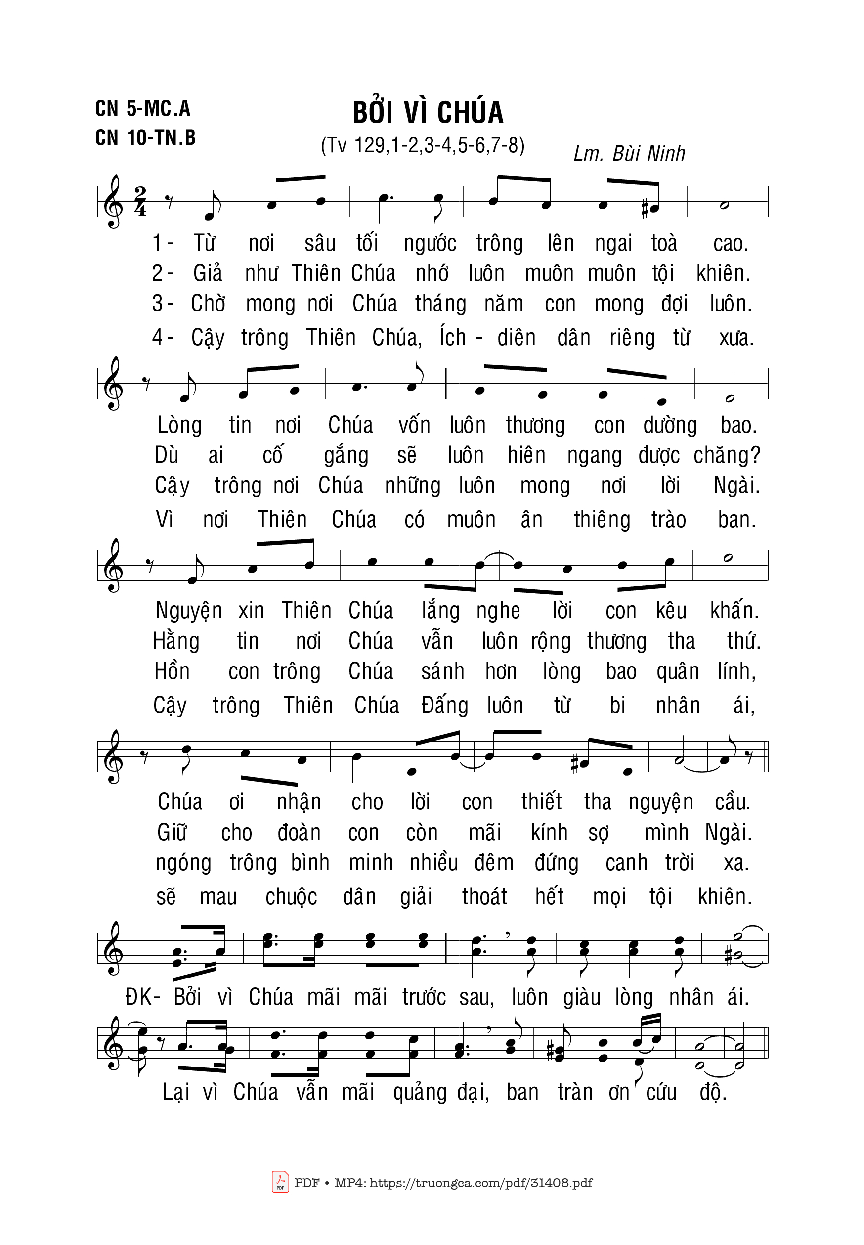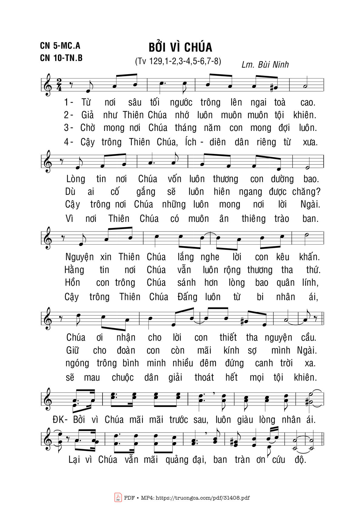 Sheet music Bởi Vì Chúa by Bùi Ninh and PDF file was posted here to support you to practice singing perfectly. Sheets with notes and chords are for reference only, for non-commercial purposes only, not involved with earning money by buying and selling. Copyright is belong to song writer/author and copyright owner. Truongca.com do not own any copyrighted content. You can download the high-quality PDF files which contain staffs by PDF link above.