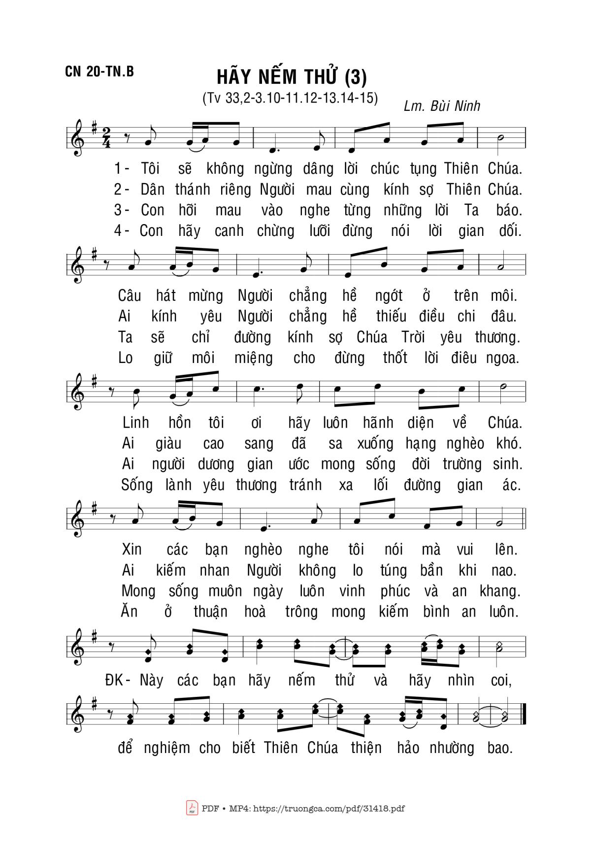 Sheet music Hãy Nếm Thử (3) by Bùi Ninh and PDF file was posted here to support you to practice singing perfectly. Sheets with notes and chords are for reference only, for non-commercial purposes only, not involved with earning money by buying and selling. Copyright is belong to song writer/author and copyright owner. Truongca.com do not own any copyrighted content. You can download the high-quality PDF files which contain staffs by PDF link above.