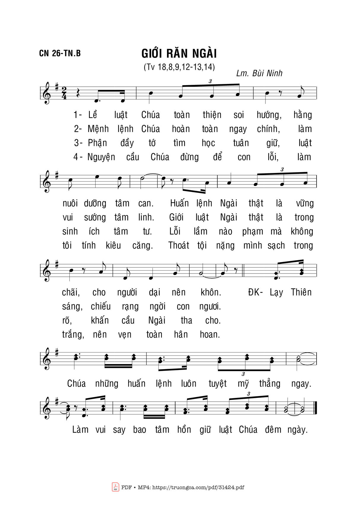 Sheet music Giới Răn Ngài by Bùi Ninh and PDF file was posted here to support you to practice singing perfectly. Sheets with notes and chords are for reference only, for non-commercial purposes only, not involved with earning money by buying and selling. Copyright is belong to song writer/author and copyright owner. Truongca.com do not own any copyrighted content. You can download the high-quality PDF files which contain staffs by PDF link above.