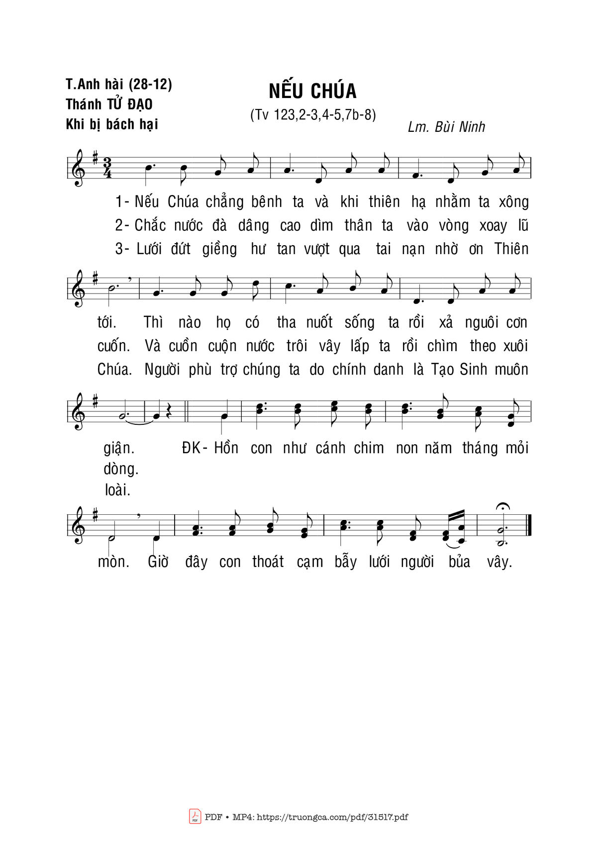 Sheet music Thánh Vịnh 123, Nếu Chúa by Bùi Ninh and PDF file was posted here to support you to practice singing perfectly. Sheets with notes and chords are for reference only, for non-commercial purposes only, not involved with earning money by buying and selling. Copyright is belong to song writer/author and copyright owner. Truongca.com do not own any copyrighted content. You can download the high-quality PDF files which contain staffs by PDF link above.