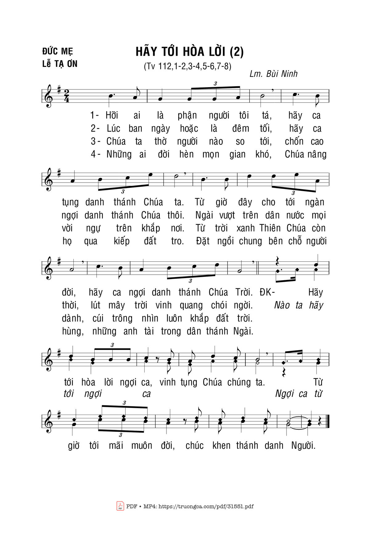 Sheet music Thánh Vịnh 112, Hãy Tới Hòa Lời (2 by Bùi Ninh and PDF file was posted here to support you to practice singing perfectly. Sheets with notes and chords are for reference only, for non-commercial purposes only, not involved with earning money by buying and selling. Copyright is belong to song writer/author and copyright owner. Truongca.com do not own any copyrighted content. You can download the high-quality PDF files which contain staffs by PDF link above.