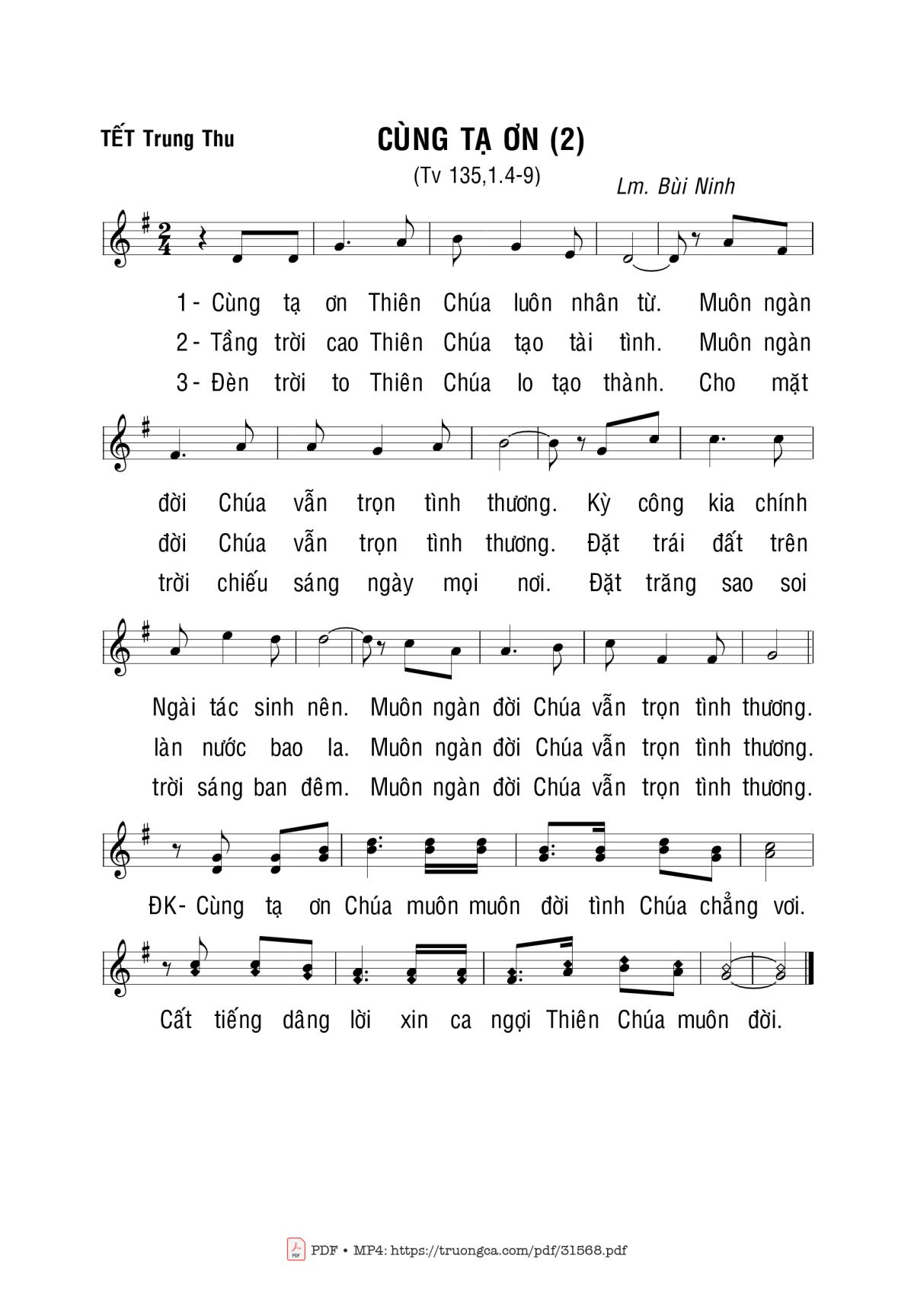 Sheet music Thánh Vịnh 135, Cùng Tạ Ơn (2 by Bùi Ninh and PDF file was posted here to support you to practice singing perfectly. Sheets with notes and chords are for reference only, for non-commercial purposes only, not involved with earning money by buying and selling. Copyright is belong to song writer/author and copyright owner. Truongca.com do not own any copyrighted content. You can download the high-quality PDF files which contain staffs by PDF link above.