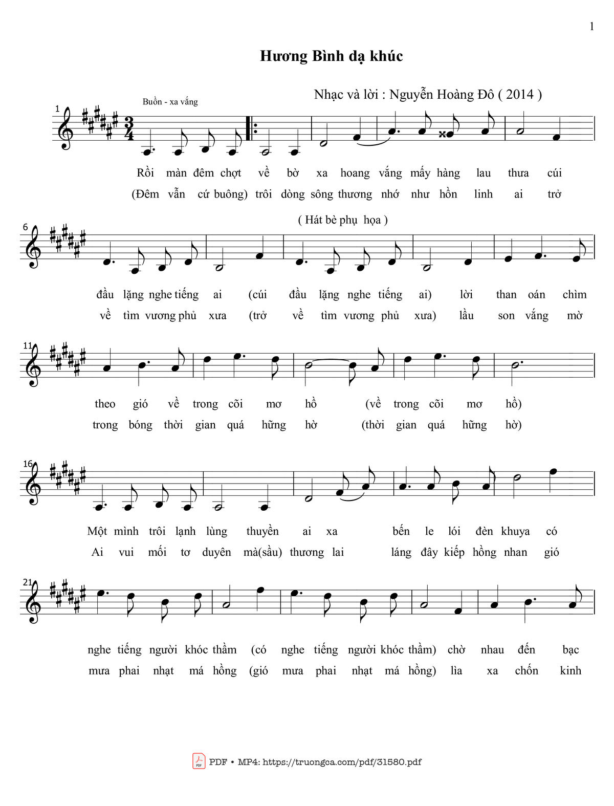 The Videos/audios Hương Bình dạ khúc by Nguyễn Hoàng Đô were embed from Youtube, Musescore or the other 3rd links. Videos are subject to 3rd's copyright control and may be removed by YouTube's copyright rules and 3rd's policies or maybe included advertisements. If you cannot access to these songs, this mean that have been removed.