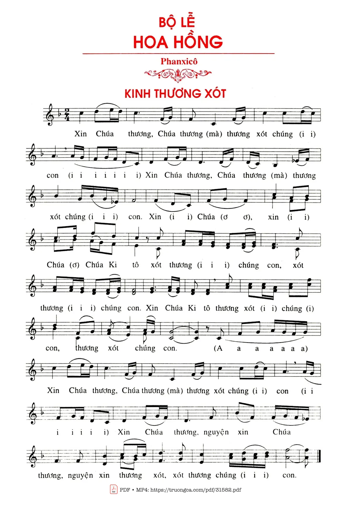 Sheet music Bộ Lễ Hoa Hồng (2 Bè) by Phanxico and PDF file was posted here to support you to practice singing perfectly. Sheets with notes and chords are for reference only, for non-commercial purposes only, not involved with earning money by buying and selling. Copyright is belong to song writer/author and copyright owner. Truongca.com do not own any copyrighted content. You can download the high-quality PDF files which contain staffs by PDF link above.