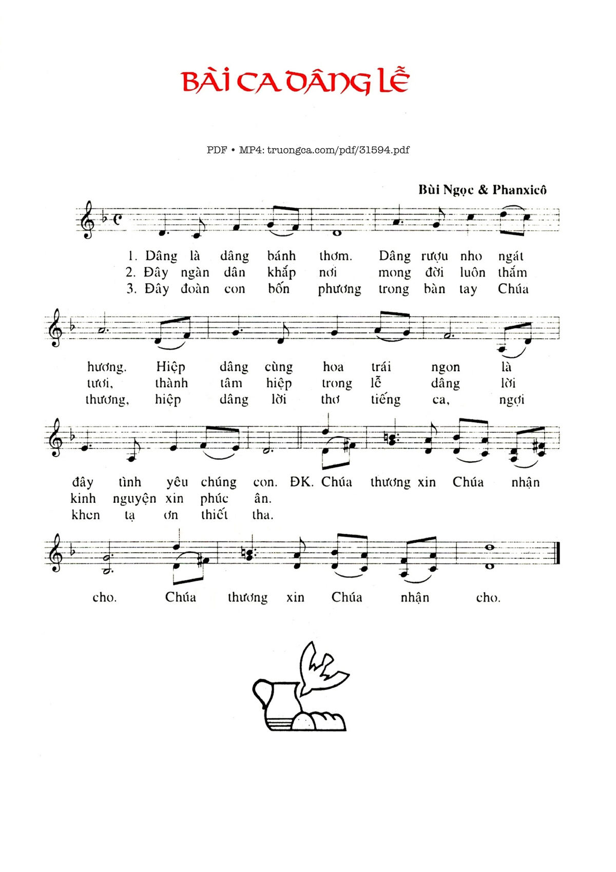 Sheet music Bài Ca Dâng Lễ by Phanxico and PDF file was posted here to support you to practice singing perfectly. Sheets with notes and chords are for reference only, for non-commercial purposes only, not involved with earning money by buying and selling. Copyright is belong to song writer/author and copyright owner. Truongca.com do not own any copyrighted content. You can download the high-quality PDF files which contain staffs by PDF link above.