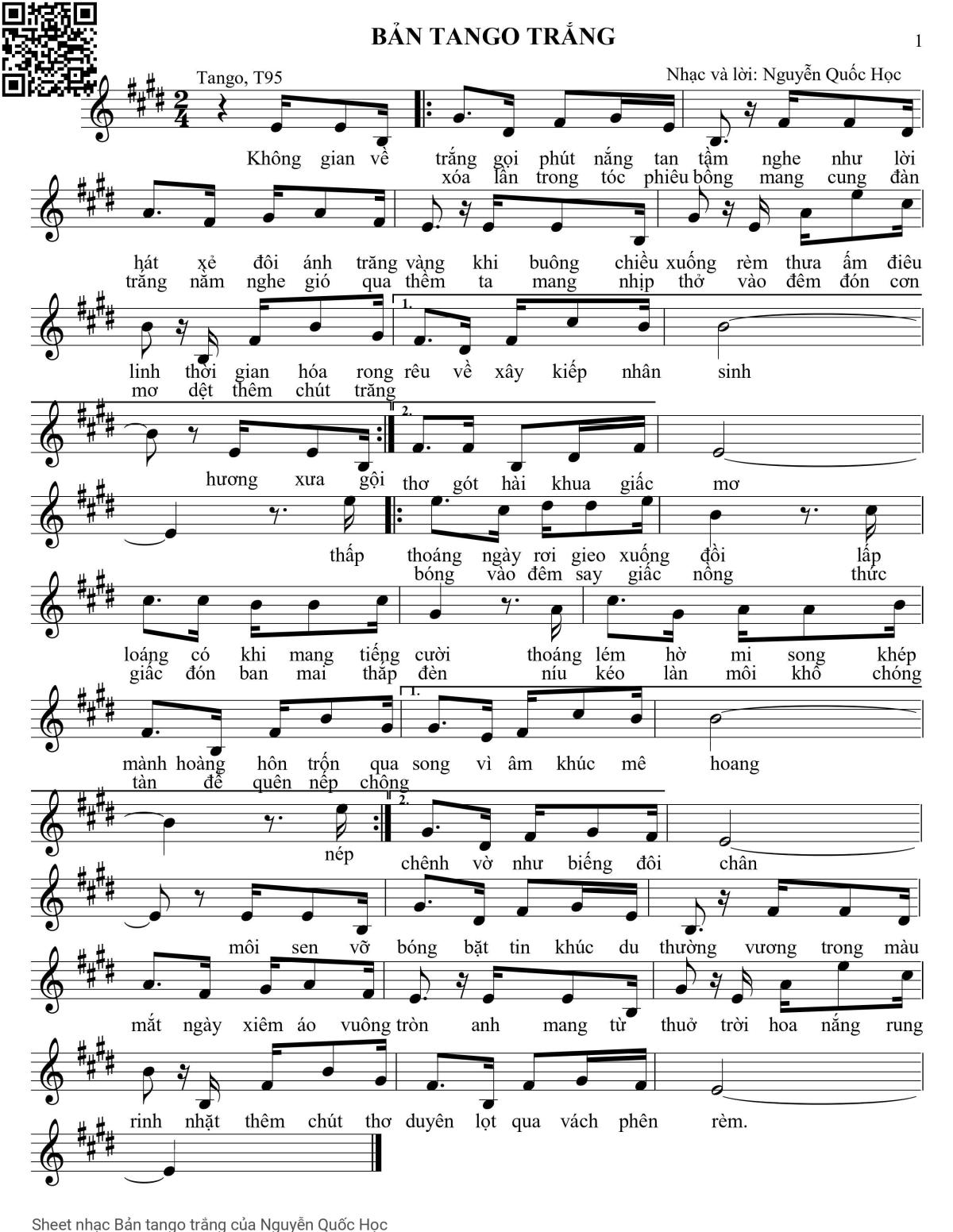 The Videos/audios Bản tango trắng by Nguyễn Quốc Học were embed from Youtube, Musescore or the other 3rd links. Videos are subject to 3rd's copyright control and may be removed by YouTube's copyright rules and 3rd's policies or maybe included advertisements. If you cannot access to these songs, this mean that have been removed.