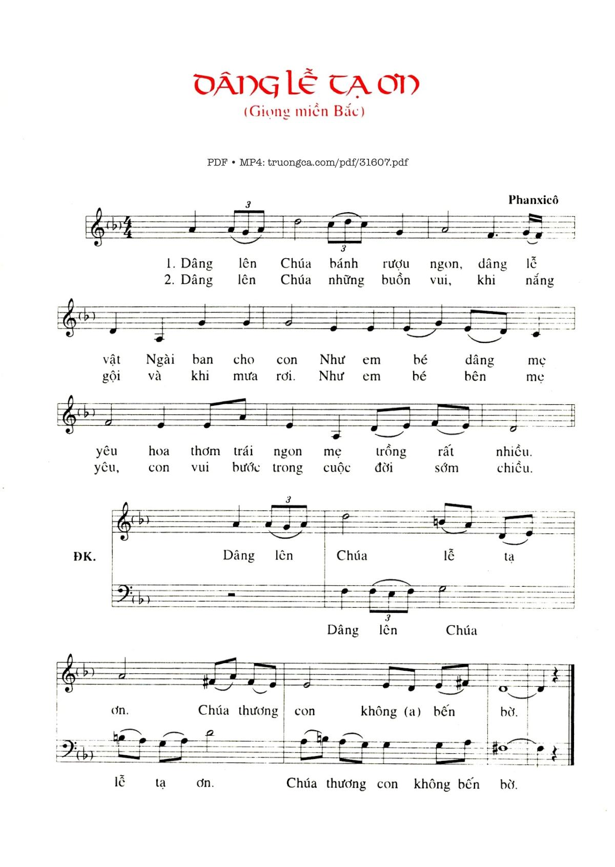 Sheet music Dâng Lễ Tạ Ơn (Bắc) by Phanxico and PDF file was posted here to support you to practice singing perfectly. Sheets with notes and chords are for reference only, for non-commercial purposes only, not involved with earning money by buying and selling. Copyright is belong to song writer/author and copyright owner. Truongca.com do not own any copyrighted content. You can download the high-quality PDF files which contain staffs by PDF link above.