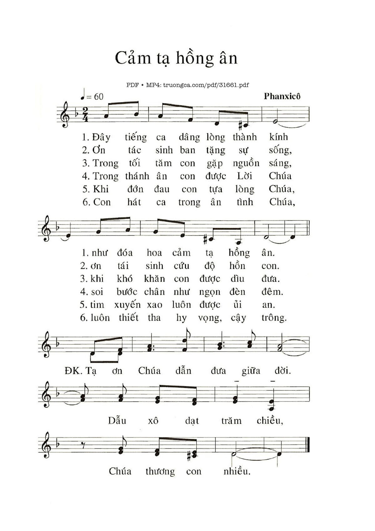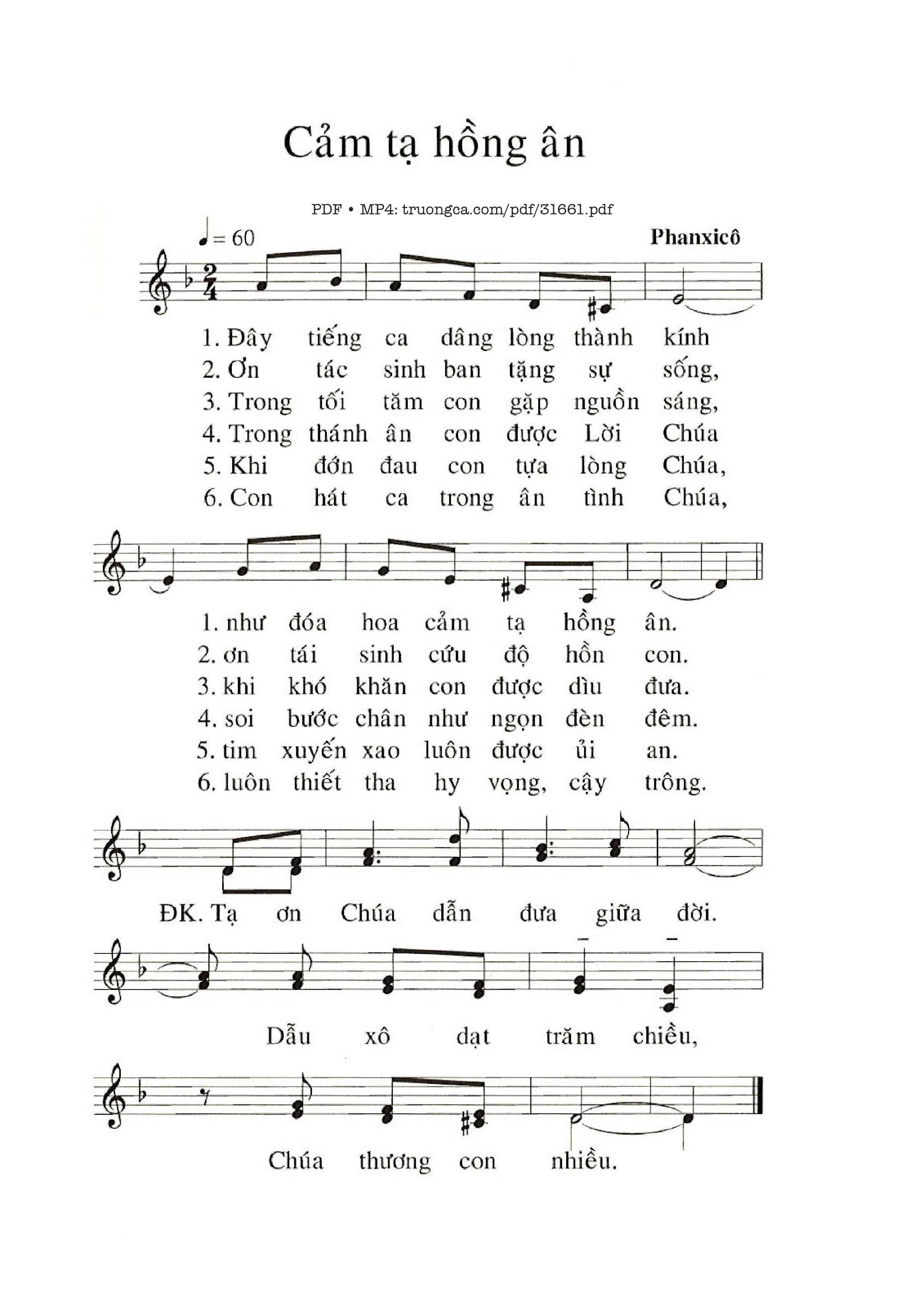 Sheet music Cảm Tạ Hồng Ân by Phanxico and PDF file was posted here to support you to practice singing perfectly. Sheets with notes and chords are for reference only, for non-commercial purposes only, not involved with earning money by buying and selling. Copyright is belong to song writer/author and copyright owner. Truongca.com do not own any copyrighted content. You can download the high-quality PDF files which contain staffs by PDF link above.