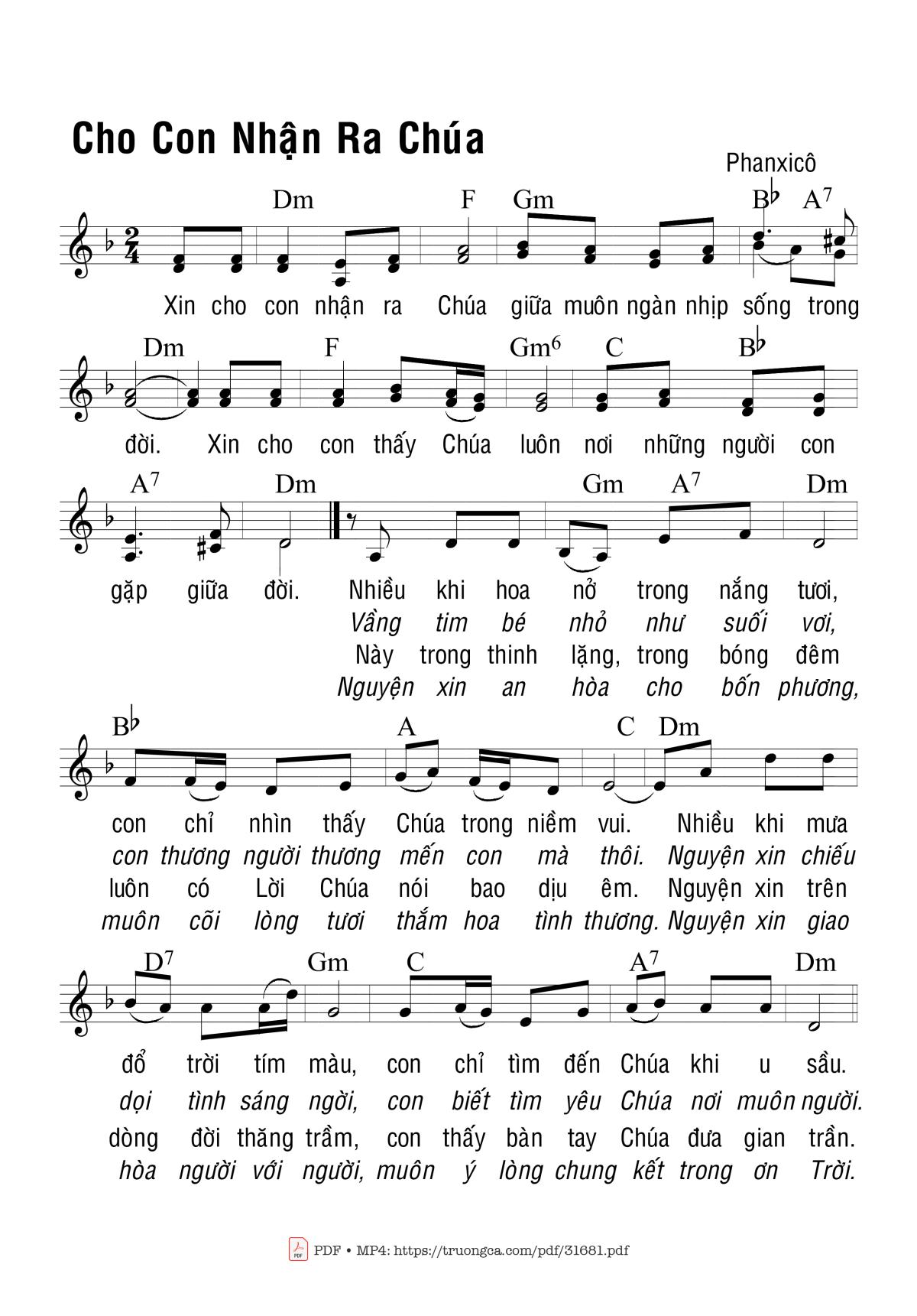 Sheet music Cho Con Nhận Ra Chúa by Phanxico and PDF file was posted here to support you to practice singing perfectly. Sheets with notes and chords are for reference only, for non-commercial purposes only, not involved with earning money by buying and selling. Copyright is belong to song writer/author and copyright owner. Truongca.com do not own any copyrighted content. You can download the high-quality PDF files which contain staffs by PDF link above.