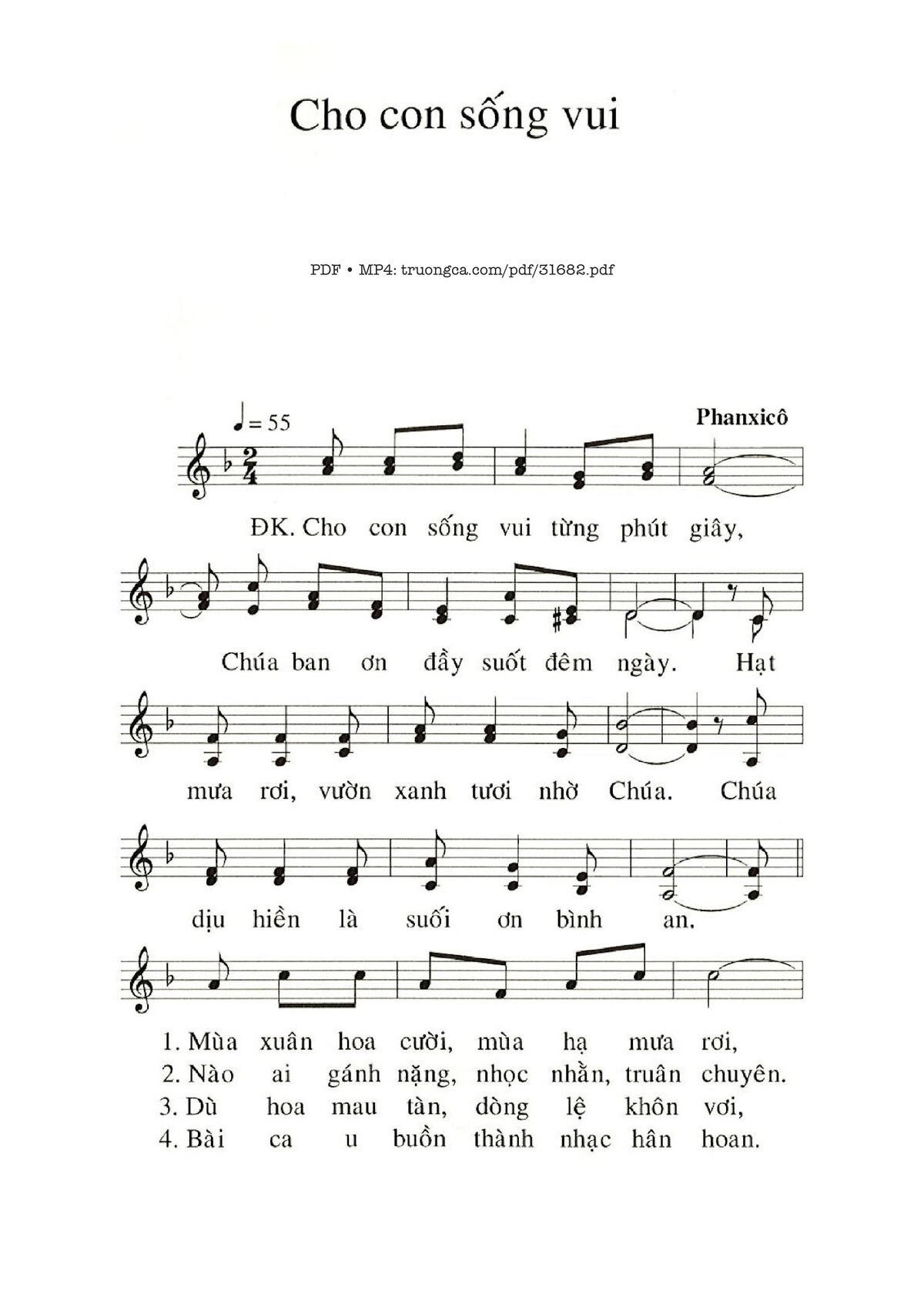 Sheet music Cho Con Sống Vui by Phanxico and PDF file was posted here to support you to practice singing perfectly. Sheets with notes and chords are for reference only, for non-commercial purposes only, not involved with earning money by buying and selling. Copyright is belong to song writer/author and copyright owner. Truongca.com do not own any copyrighted content. You can download the high-quality PDF files which contain staffs by PDF link above.