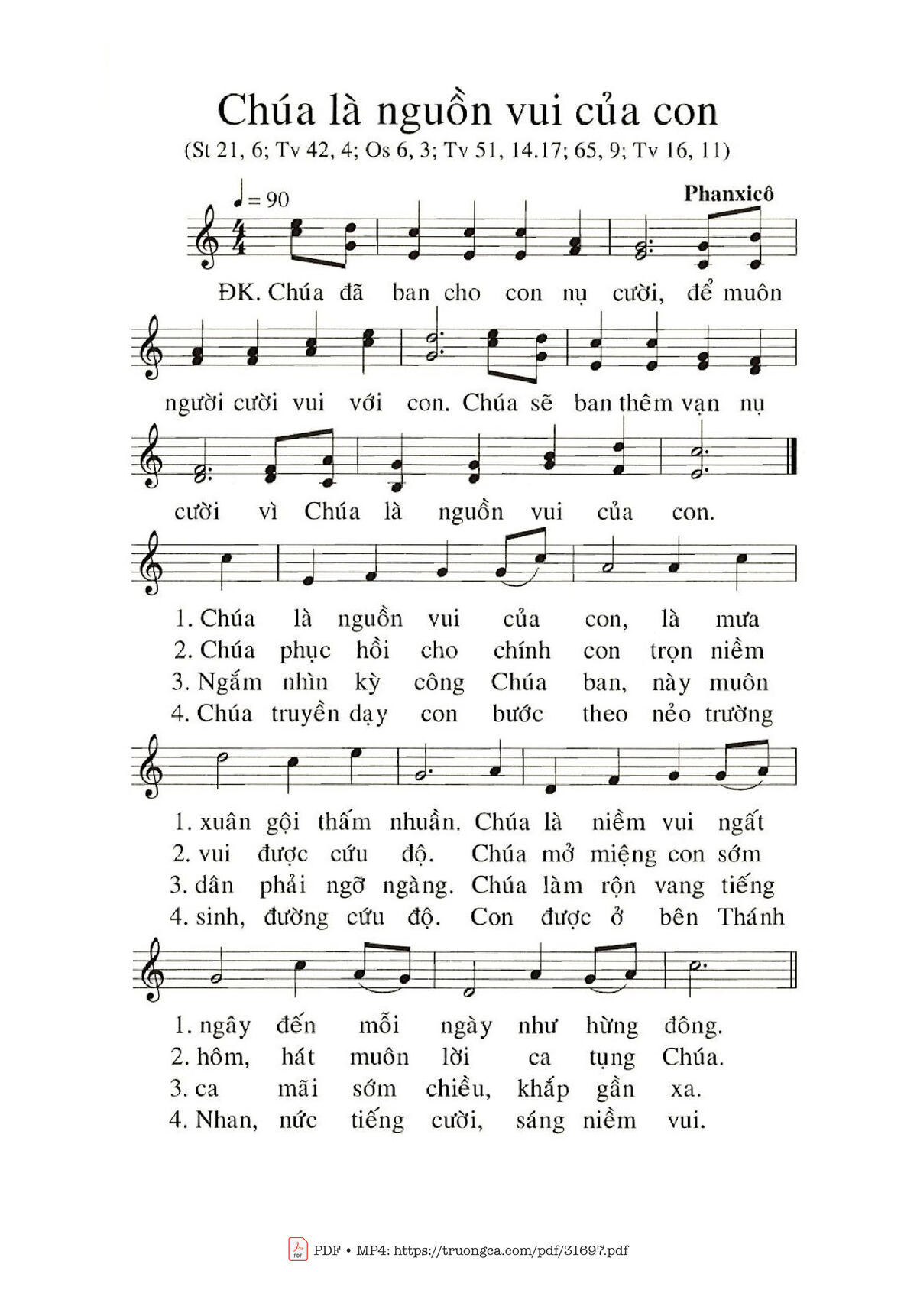 Sheet music Chúa Là Nguồn Vui Của Con by Phanxico and PDF file was posted here to support you to practice singing perfectly. Sheets with notes and chords are for reference only, for non-commercial purposes only, not involved with earning money by buying and selling. Copyright is belong to song writer/author and copyright owner. Truongca.com do not own any copyrighted content. You can download the high-quality PDF files which contain staffs by PDF link above.